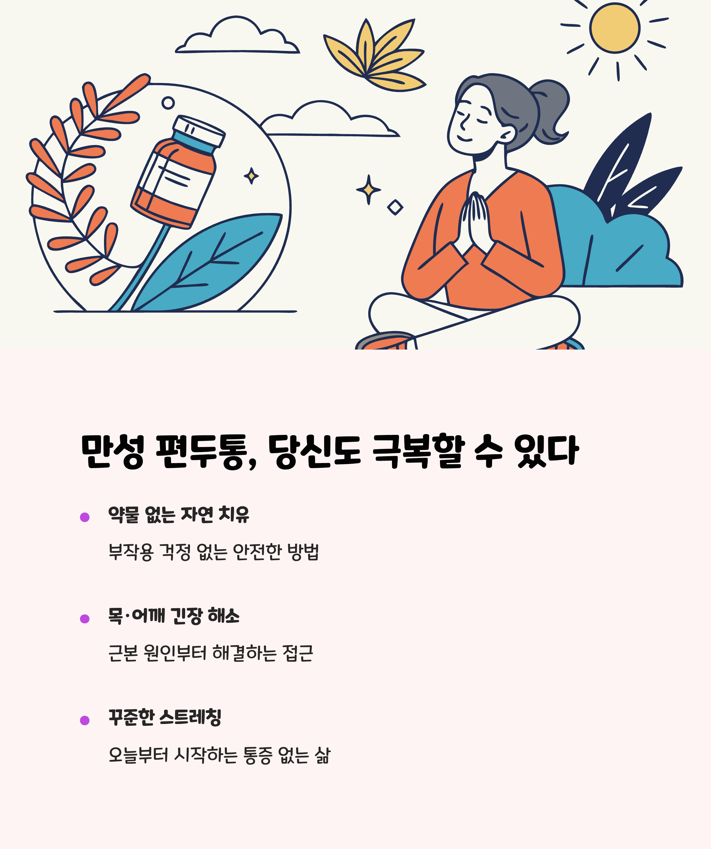 약물 대신 스트레칭과 이완 기법, 심호흡, 규칙적 운동, 충분한 수면, 수분 섭취, 스트레스 관리가 중요합니다. 특히 목과 어깨 근육 이완 스트레칭으로 혈액순환을 개선하고 근육 긴장을 줄여 두통 완화에 기여합니다.