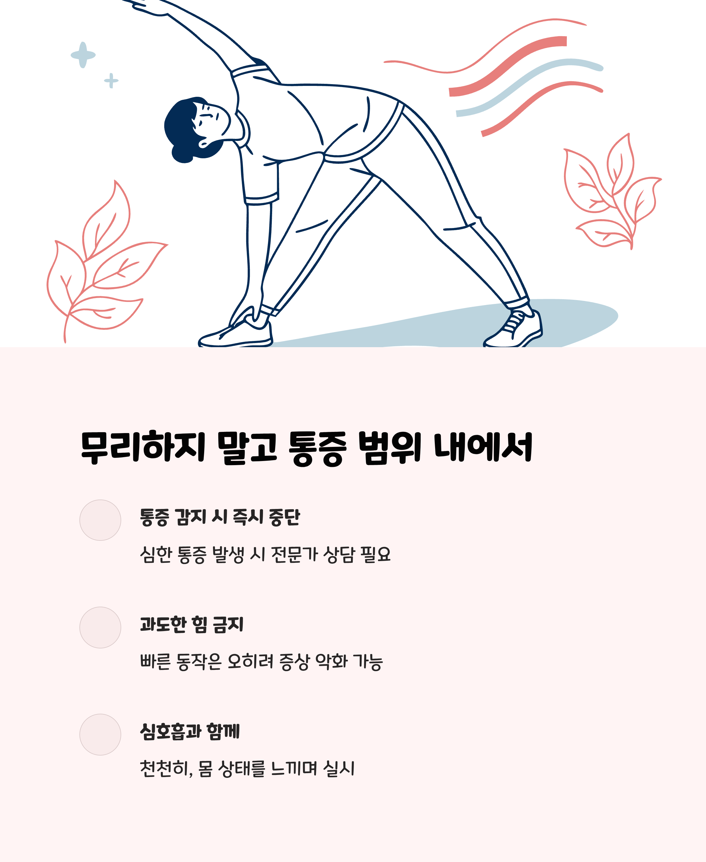 | 유산소 운동 | 가벼운 걷기, 조깅 등 심호흡과 함께 30분 이상 수행 | 매일 30분~1시간 | 혈액순환 개선, 산소 공급 증가, 스트레스 완화 |