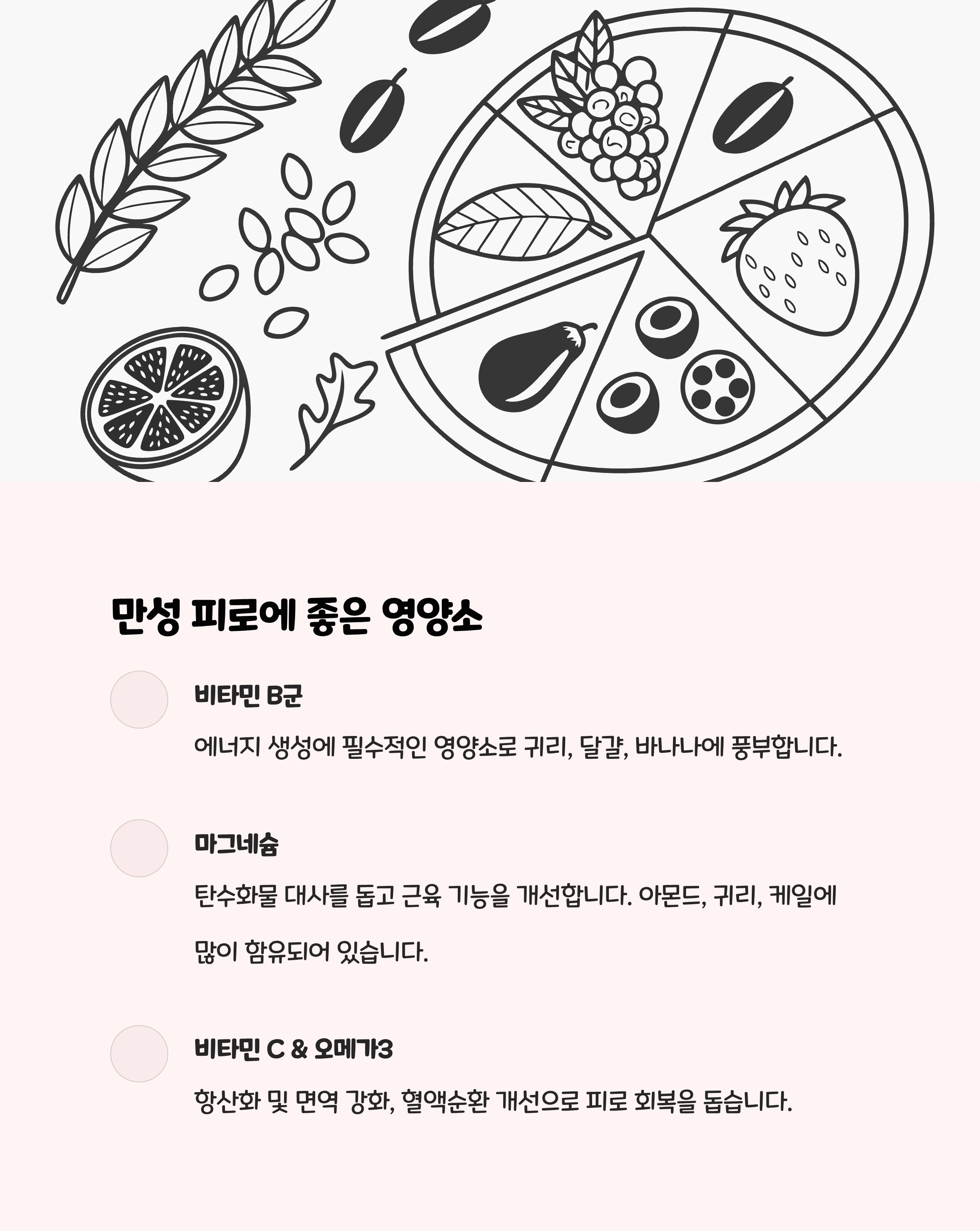비타민B군, 비타민C, 비타민E, 마그네슘, 철분 등이 주요 영양소입니다. 이들은 에너지 대사와 산화 스트레스 완화에 관여하며, 균형 잡힌 식단으로 섭취하는 것이 중요합니다.