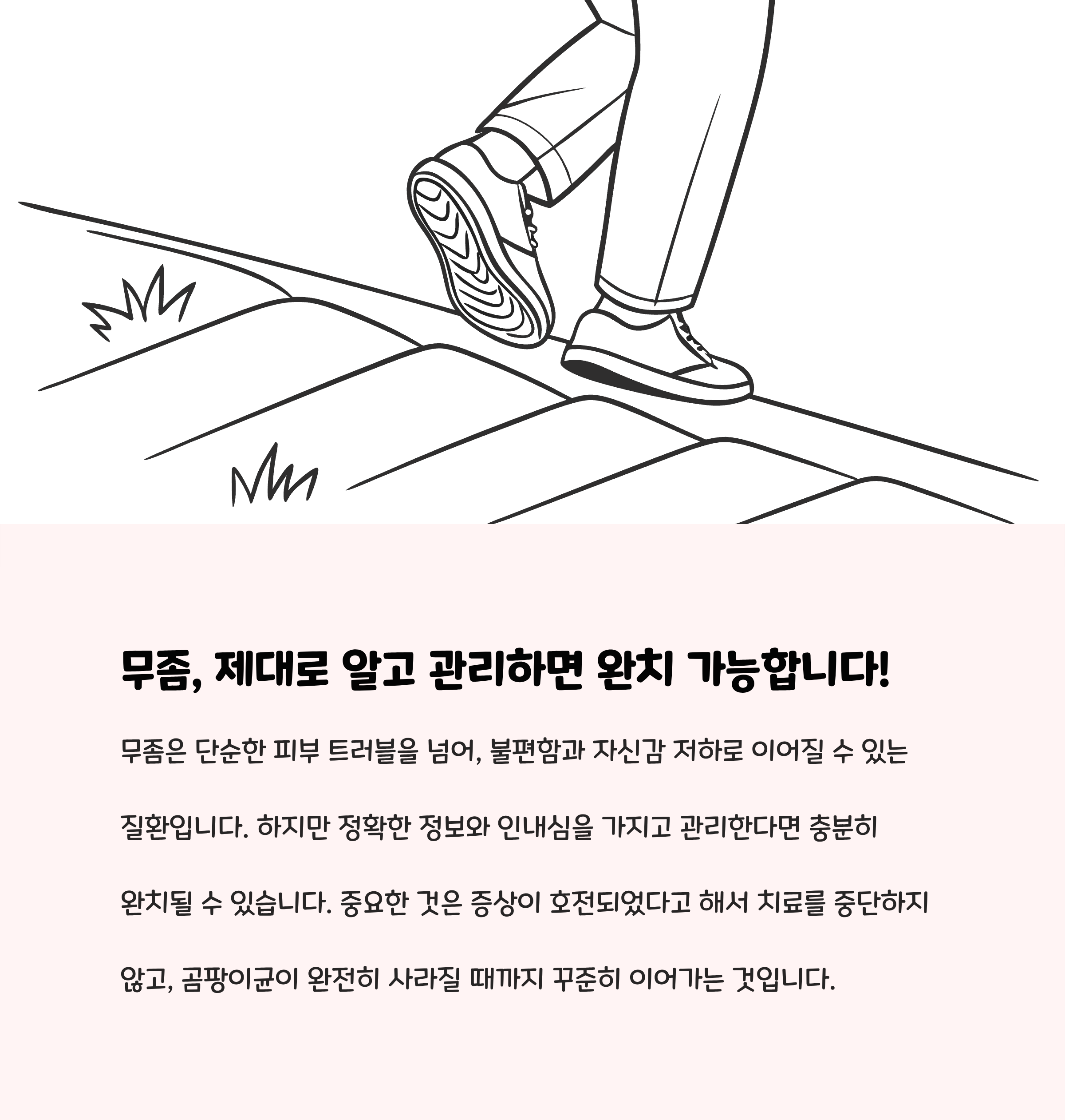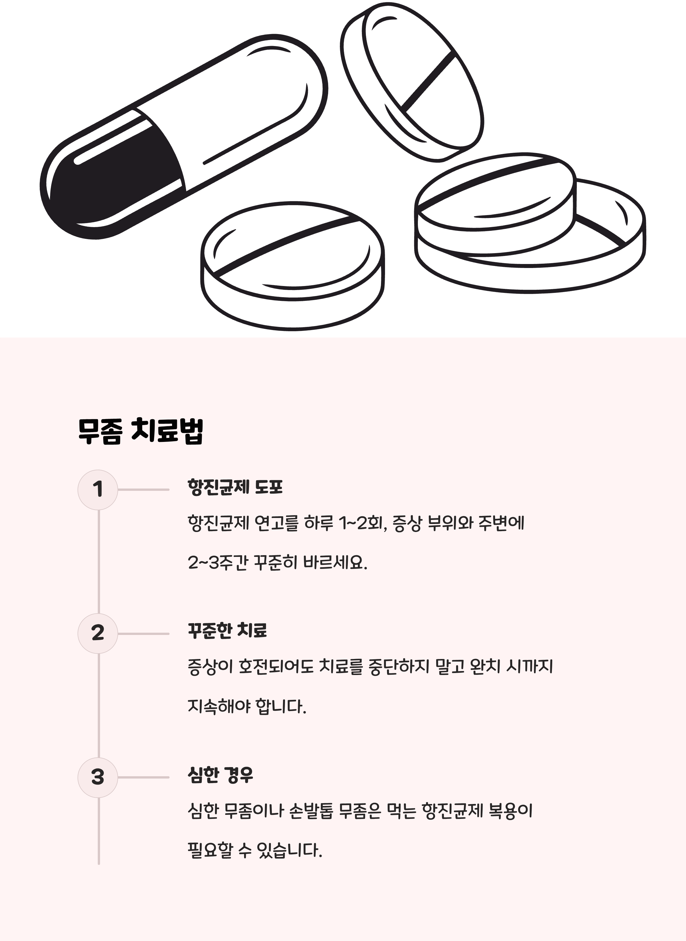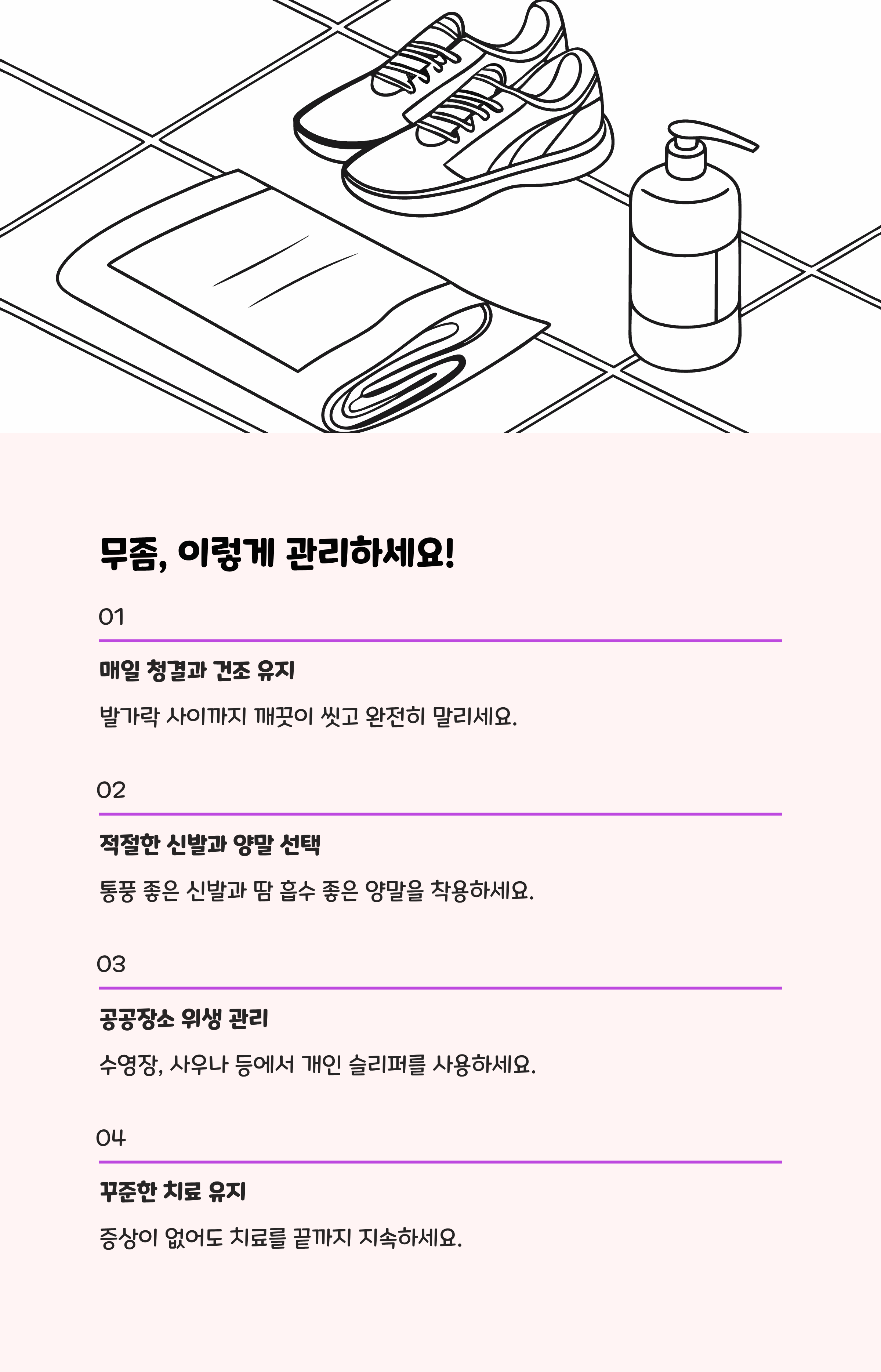 - 무좀 부위를 긁거나 벗겨내지 말고, 청결과 건조를 유지한다.