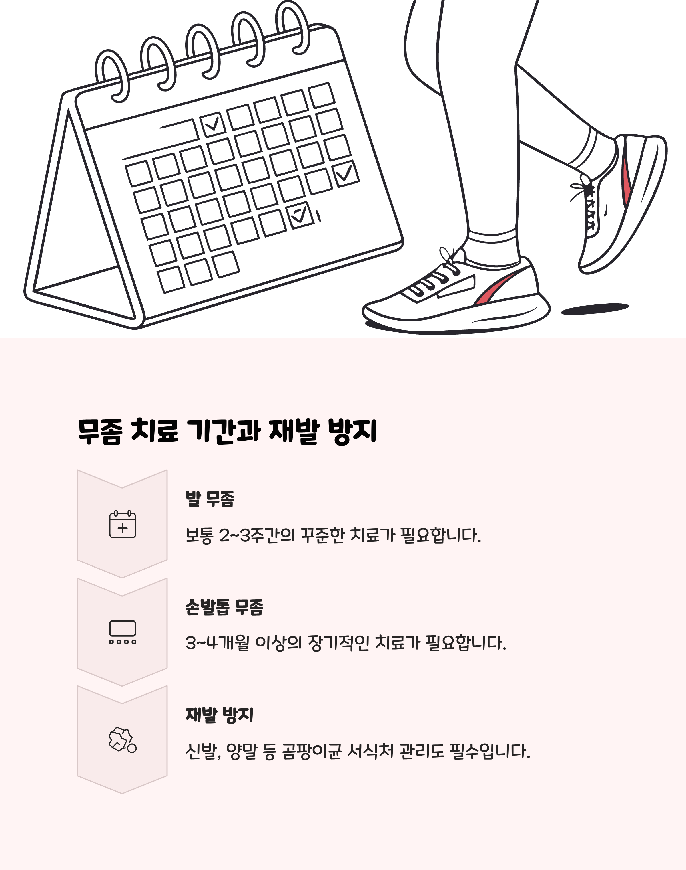 | 발 무좀 | 2~3주 | 항진균제 도포제, 경구제 | 꾸준한 족욕과 생활습관 병행 필수 |