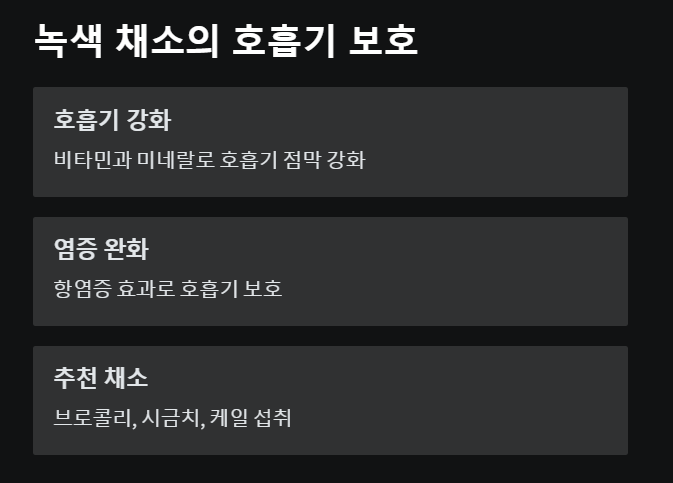 미세먼지는 호흡기 질환을 유발할 수 있습니다. 녹색 채소에는 비타민과 미네랄이 풍부하여 호흡기 점막을 강화하고 염증을 완화하는 데 도움을 줍니다. 브로콜리, 시금치, 케일 등 녹색 채소를 충분히 섭취하는 것이 좋습니다.