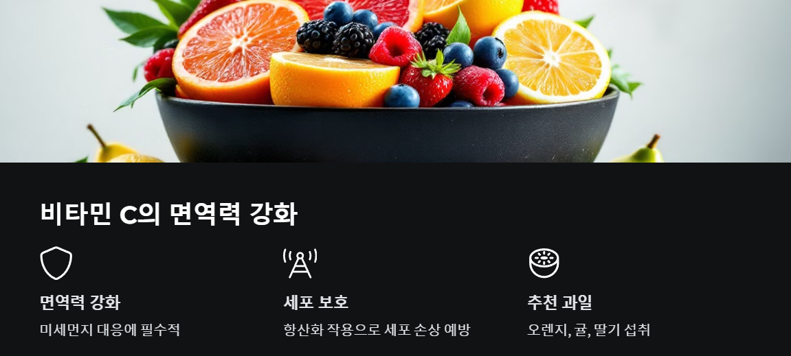 미세먼지로부터 우리 몸을 보호하기 위해서는 면역력 강화가 필수적입니다. 비타민 C는 면역력 강화에 중요한 역할을 하며, 항산화 작용을 통해 미세먼지로 인한 세포 손상을 예방하는 데 도움을 줍니다. 오렌지, 귤, 딸기 등 비타민 C가 풍부한 과일을 꾸준히 섭취하는 것이 좋습니다.