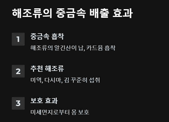 미세먼지에는 납, 카드뮴 등 다양한 중금속이 포함되어 있습니다. 해조류에 풍부한 알긴산은 이러한 중금속을 흡착하여 배출하는 데 도움을 줍니다. 미역, 다시마, 김 등 다양한 해조류를 꾸준히 섭취하면 미세먼지로부터 우리 몸을 보호할 수 있습니다.