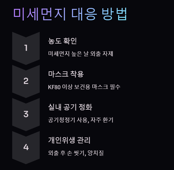 • 미세먼지 농도 확인 및 외출 자제 : 미세먼지 농도가 높은 날에는 외출을 자제하고, 외출 시에는 KF80 이상의 보건용 마스크를 착용하는 것이 좋습니다.