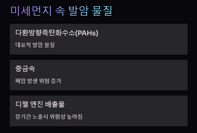 • 다양한 발암 물질 함유 : 미세먼지에는 다양한 발암 물질이 포함되어 있습니다. 다환방향족탄화수소(PAHs), 중금속, 디젤 엔진 배출물 등은 대표적인 발암 물질로, 폐암 발생 위험을 높이는 것으로 알려져 있습니다.
