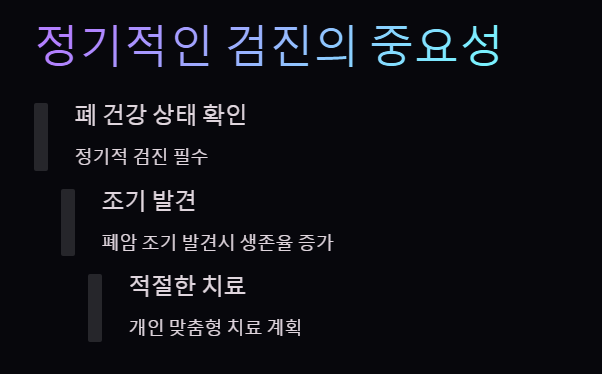 • 정기적인 검진 : 정기적인 건강 검진을 통해 폐 건강 상태를 확인하고, 폐암 조기 발견 및 치료에 힘쓰는 것이 중요합니다.