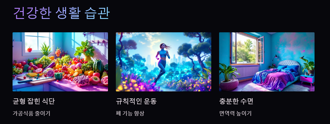 • 규칙적인 운동 : 꾸준한 유산소 운동과 근력 운동은 면역력을 강화하고 폐 기능을 향상시키는 데 도움이 됩니다.