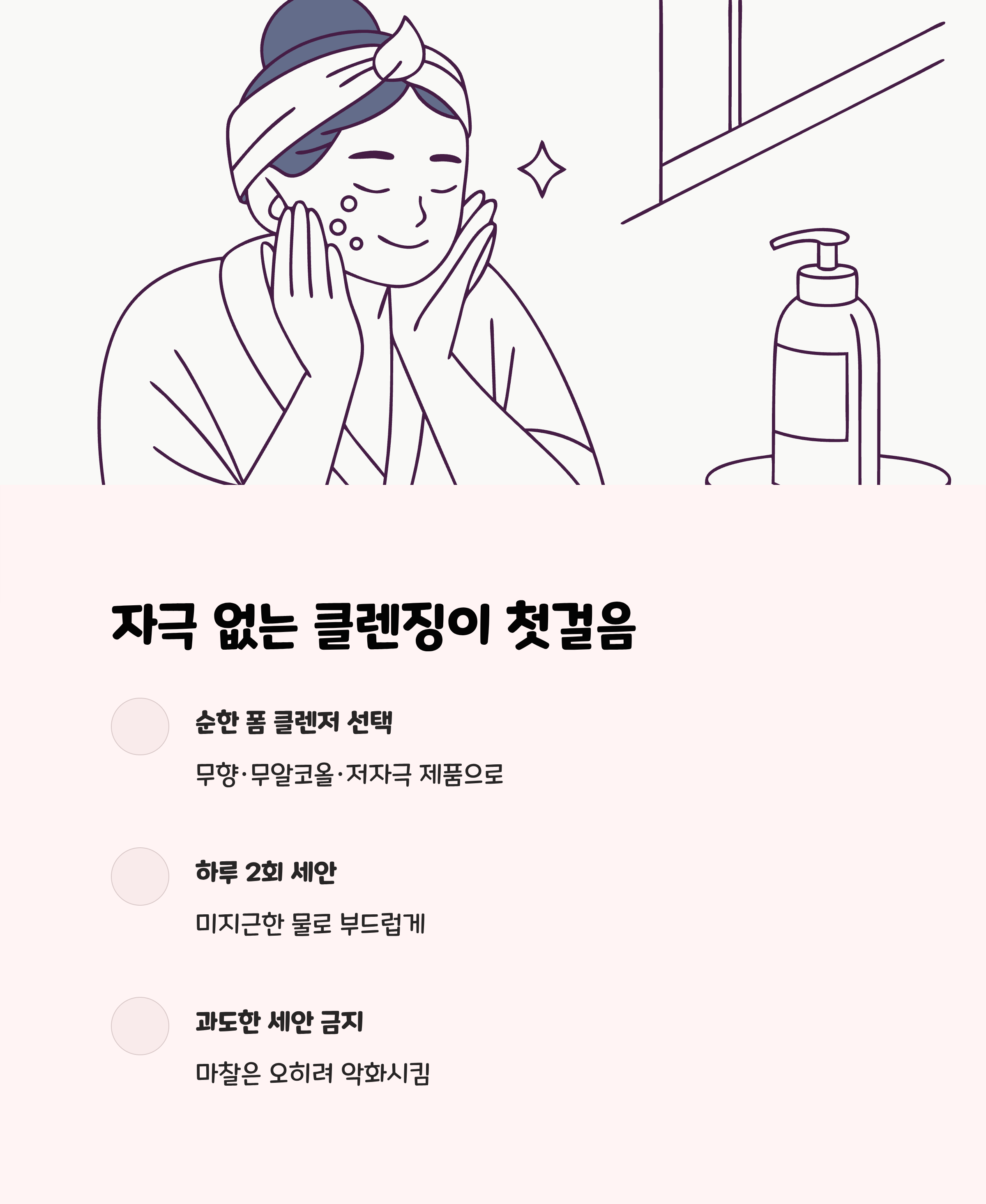 - 과도한 세안은 피부 장벽을 약화시키니, 하루 2회 이하로 제한