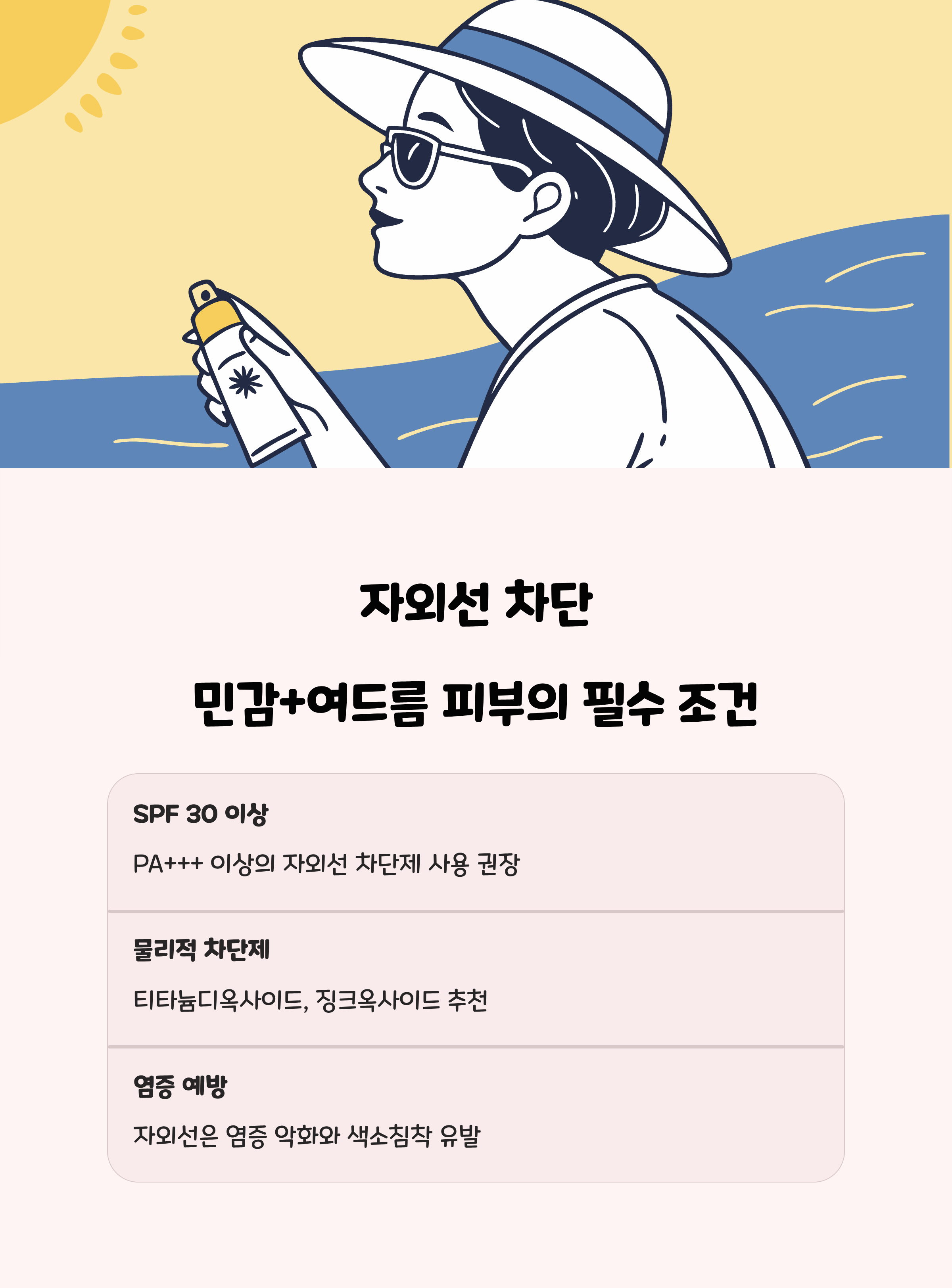 | 자외선 차단제 | SPF30 이상, 물리적 차단 성분 | 자극성 화학 차단제 | 피부 보호, 색소 침착 예방 |