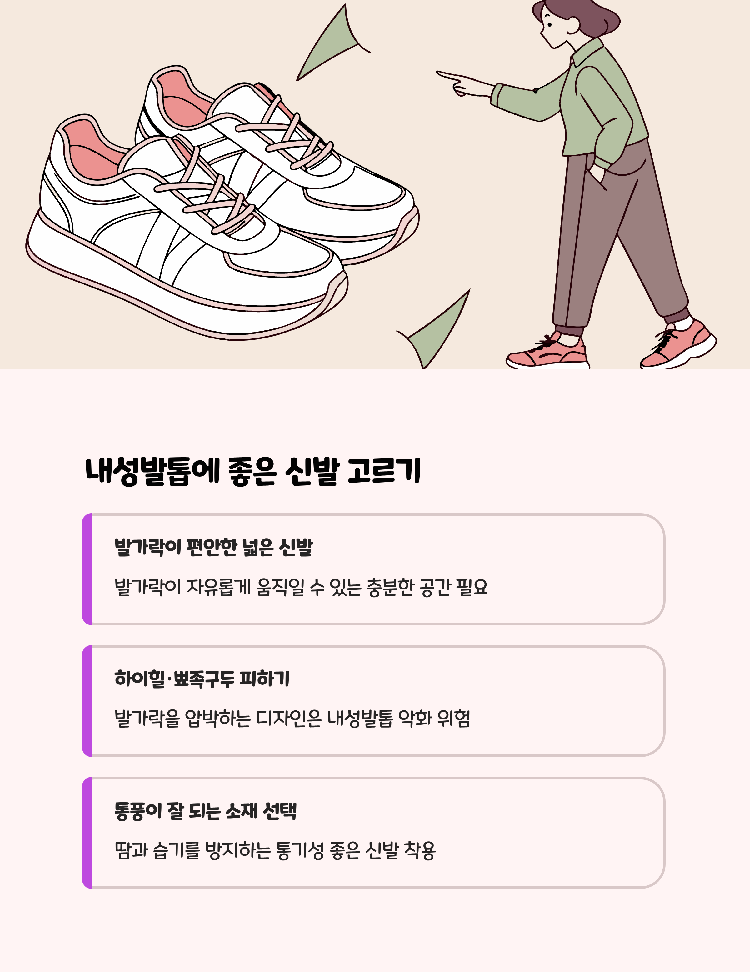 - 지나치게 타이트한 신발(운동화, 하이힐 등)은 피하세요. 헐렁하고 통풍이 잘 되는 편한 신발을 신는 게 중요합니다.