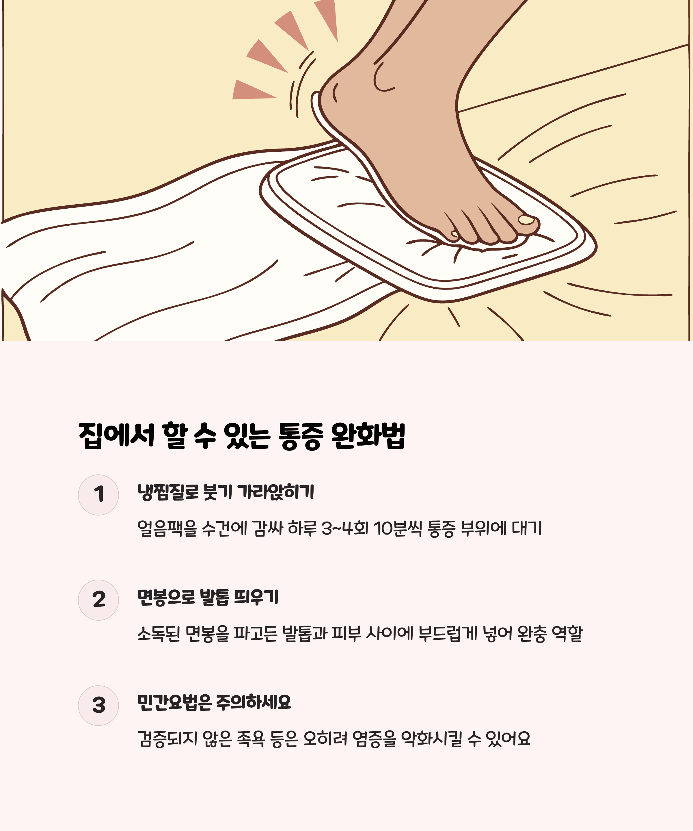 - 발을 매일 깨끗하게 관리하고, 필요하면 생리식염수에 10~20분간 족욕을 해 염증 완화에 도움을 주세요.