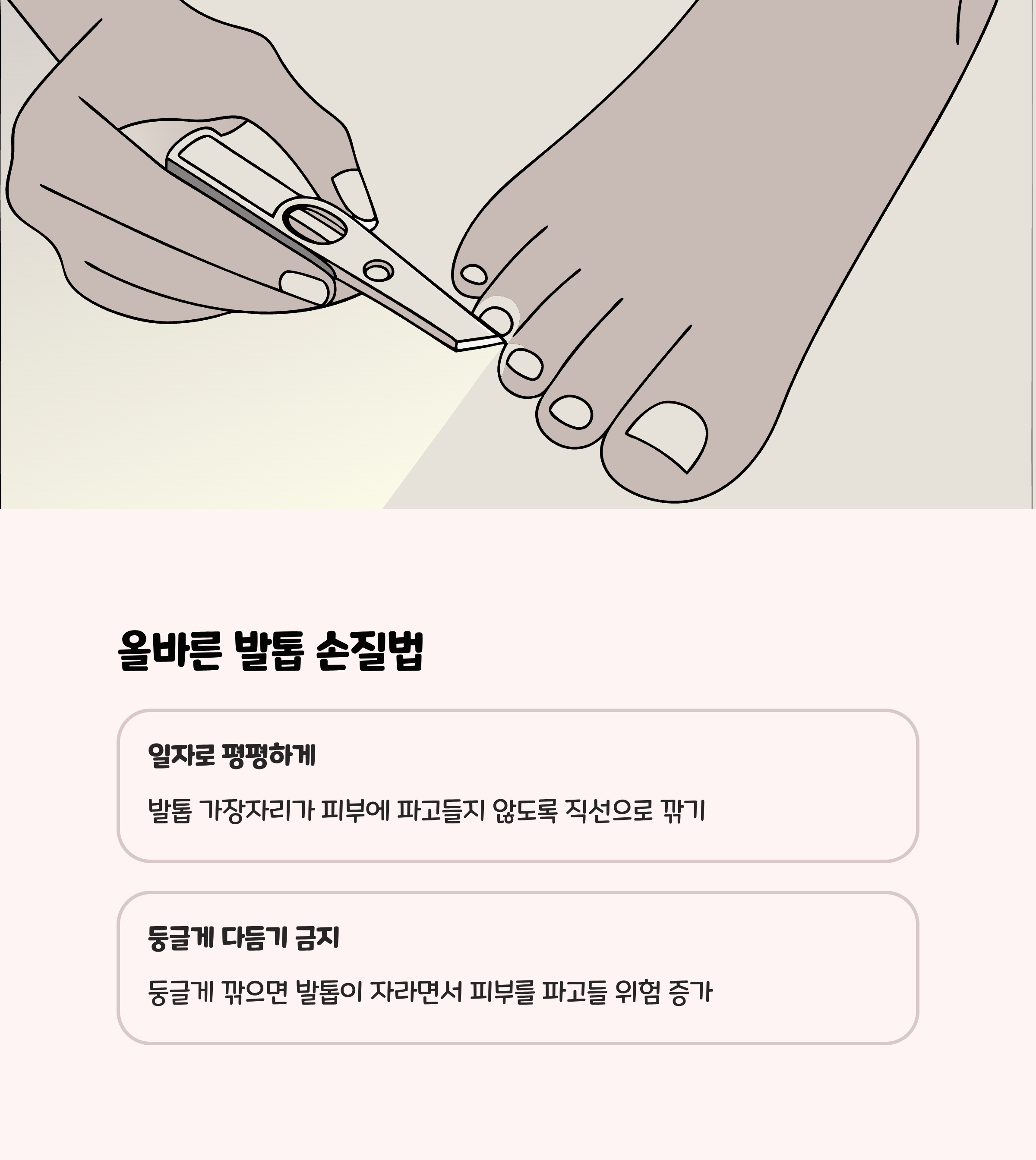 • 발톱은 둥글게, 짧게 자르지 말고, 일자로 평평하게 깎는 것이 가장 좋습니다. 이는 내성발톱 예방과 통증 완화 모두에 중요합니다.