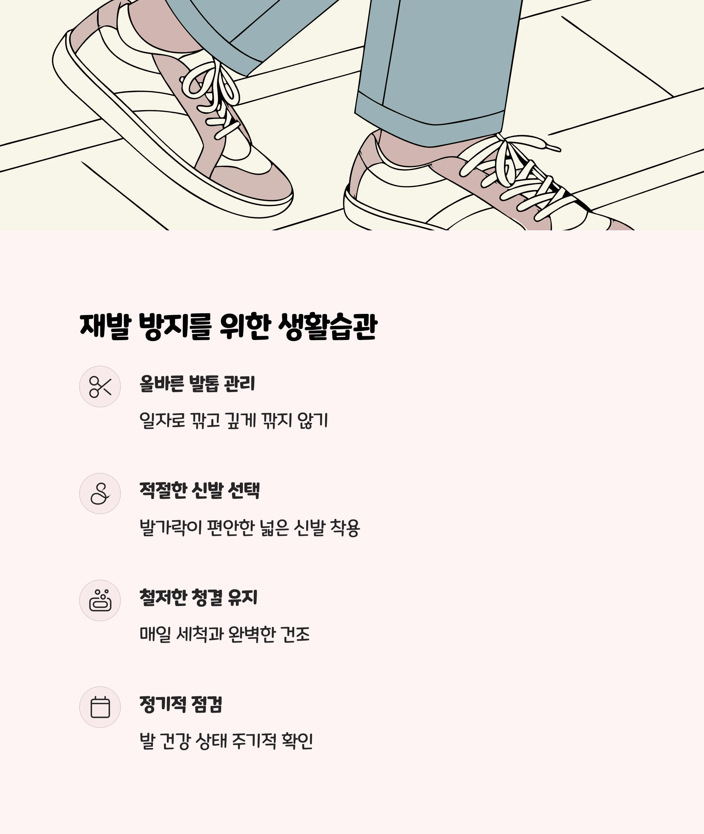 만성 또는 재발 매해 재발률 15~30%, 평소 올바른 손질 습관 유지, 무좀치료 병행 정기 검진, 생활습관/신발 교정 병행