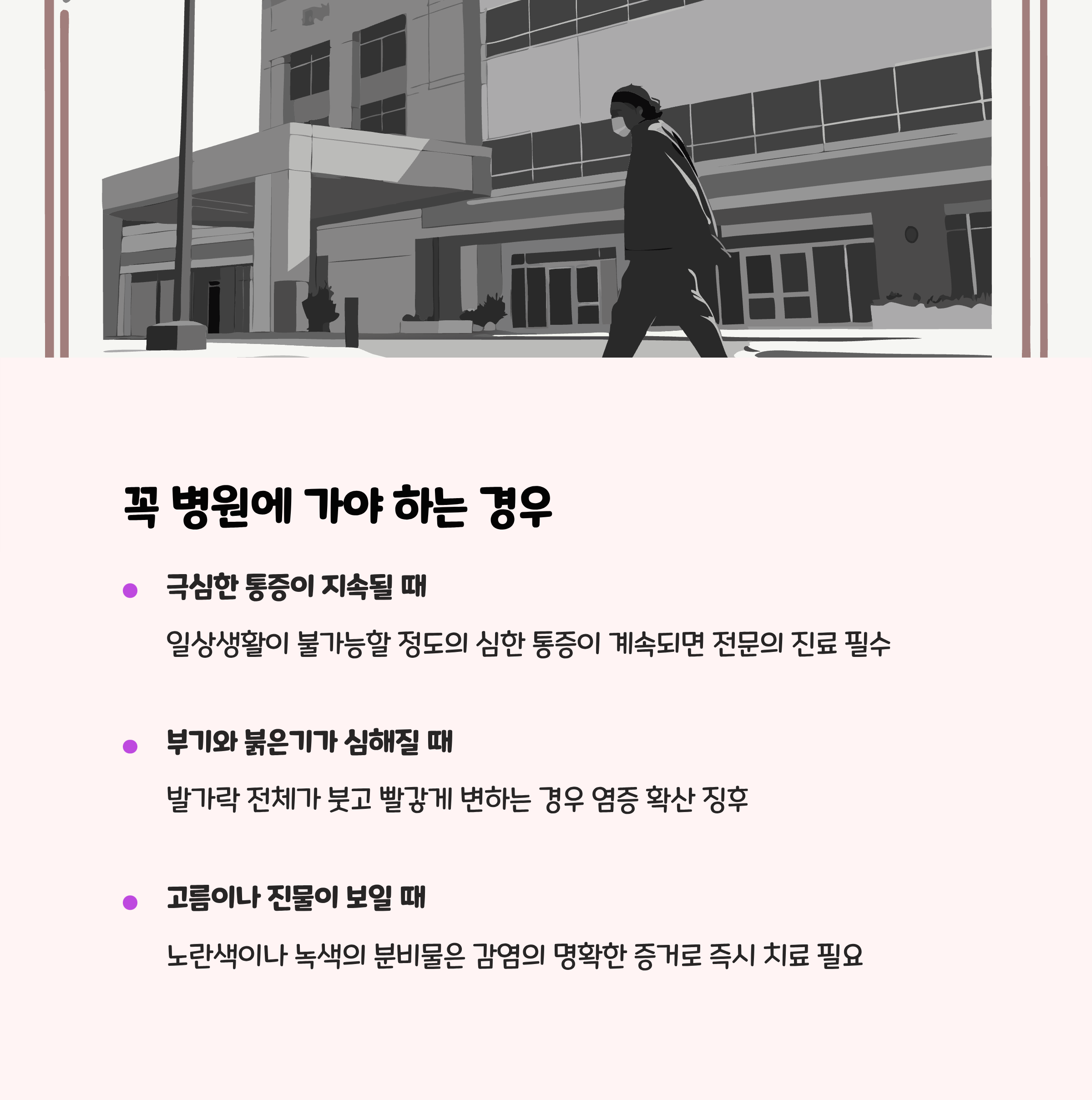 통증, 붓기, 발적이 심하거나 고름이 생긴 경우, 증상이 2~3일 이상 호전되지 않거나 기저질환(당뇨 등)이 있을 때엔 반드시 병원을 방문해야 합니다. 방치 시 감염 위험이 높아집니다.