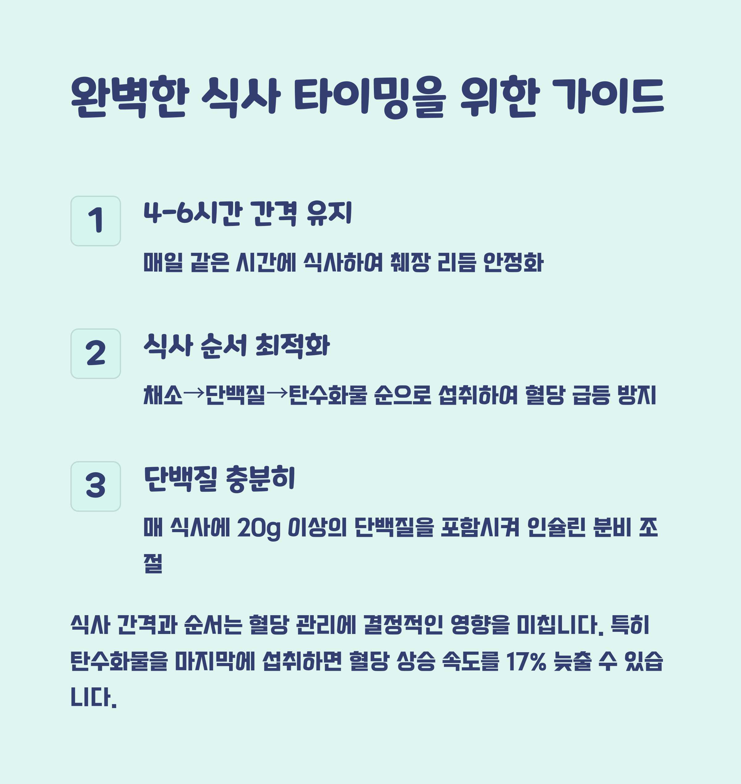 식사 간격을 4~5시간으로 유지하고, 견과류(아몬드 23알, 약 30g)나 삶은 달걀 등 건강한 간식으로 공복 시간을 메우세요. 이렇게 하면 혈당 변동폭이 34% 감소하는 효과가 있습니다.