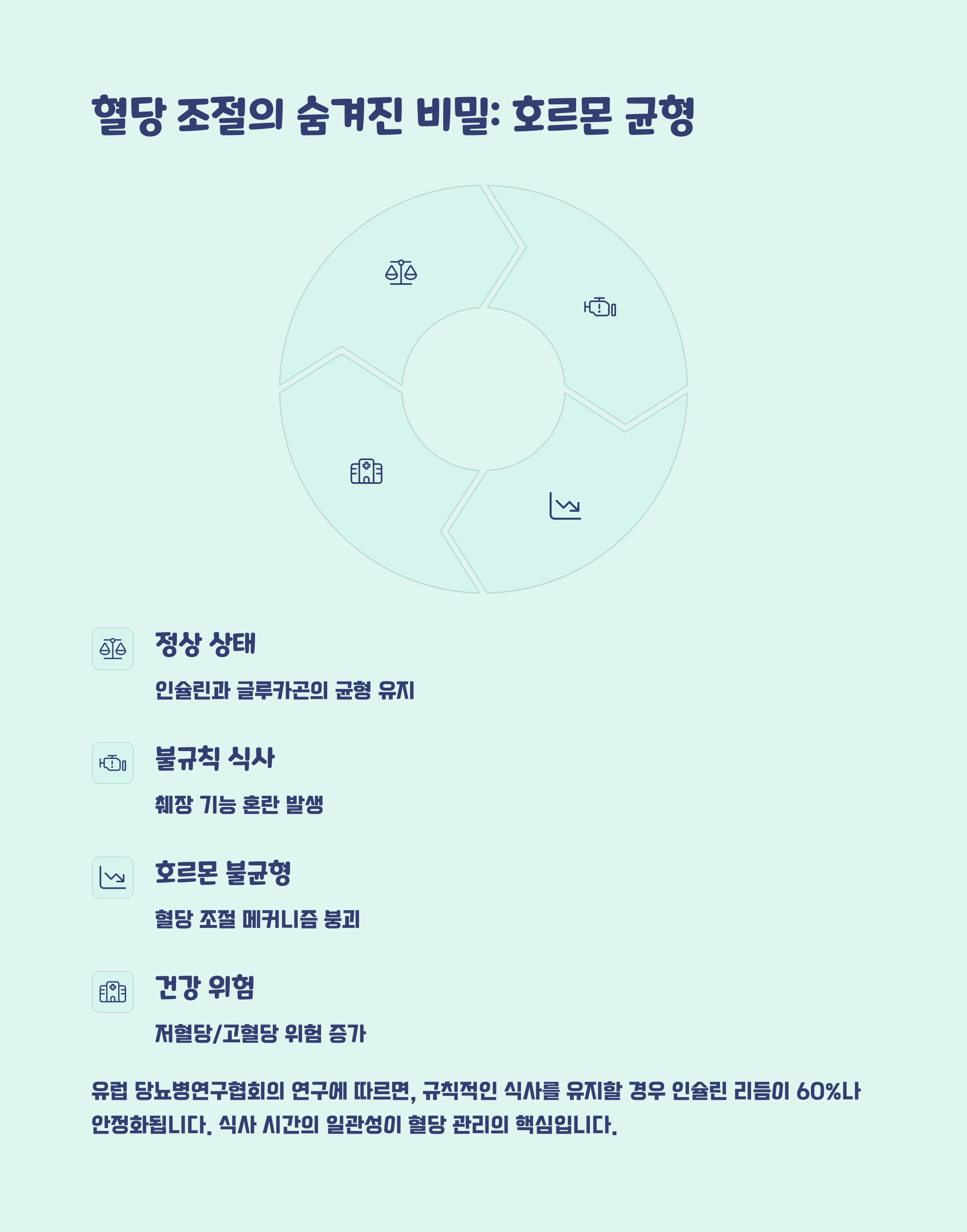 체내 혈당 조절은 췌장에서 분비되는 인슐린과 글루카곤의 정교한 상호작용으로 이루어집니다. 식후 혈당 상승 시 인슐린이 분비되어 포도당을 세포 내로 운반하며, 공복 시에는 글루카곤이 간에 저장된 글리코겐을 분해해 혈당을 유지합니다. 이 시스템이 24시간 주기로 규칙적인 식사 패턴과 동기화될 때 최적의 기능을 발휘합니다.
