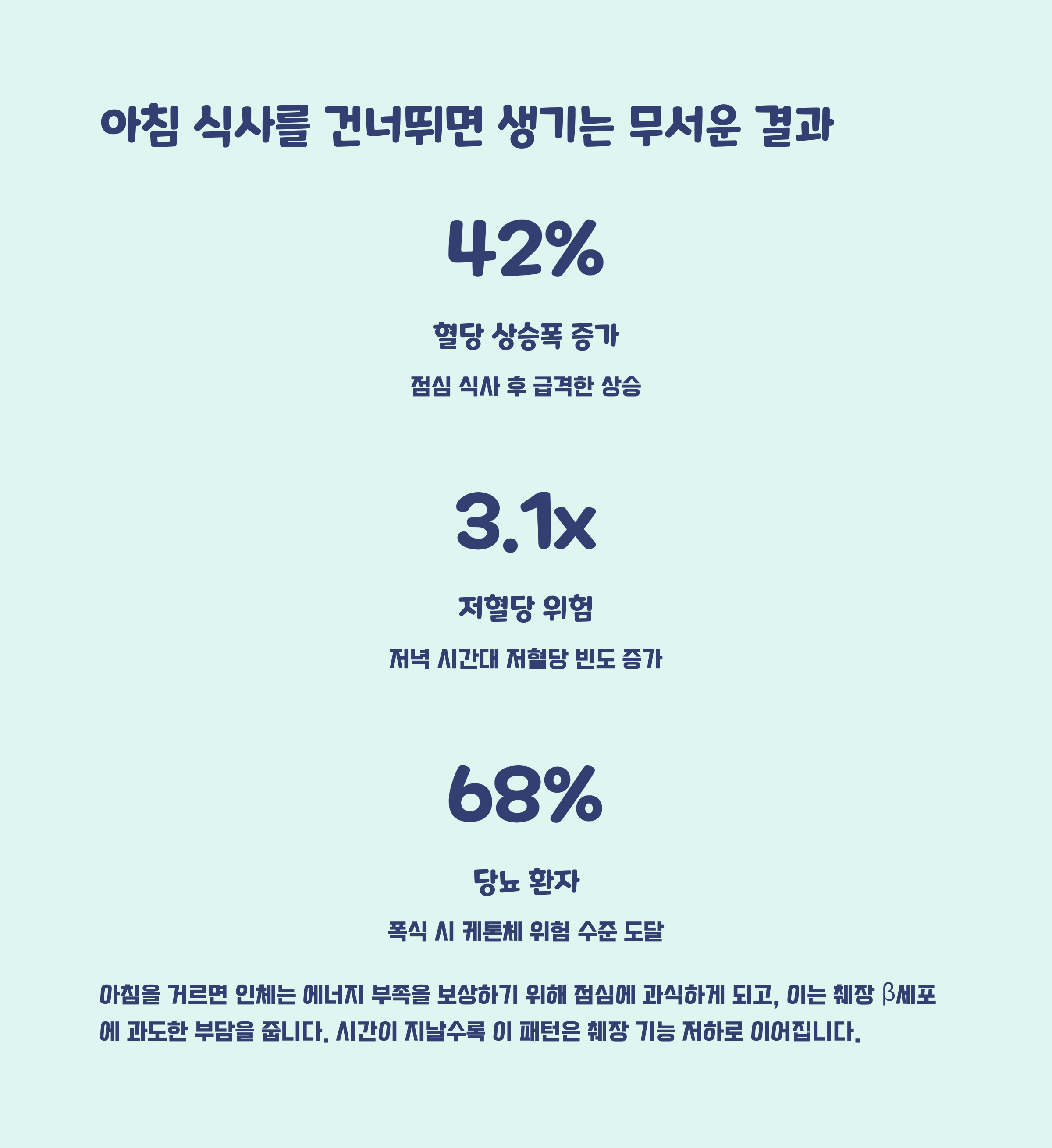 아침을 거르면 인슐린 분비 리듬이 깨져 점심 식후 혈당이 급격히 오릅니다. 실제 연구에 따르면 아침 결식 시 점심 식후 혈당 상승폭이 42% 증가하고, 저녁 시간대 저혈당 발생 빈도도 3.1배 높아집니다. 이는 당뇨병 위험을 높이고, 혈관 건강에도 악영향을 미칩니다.