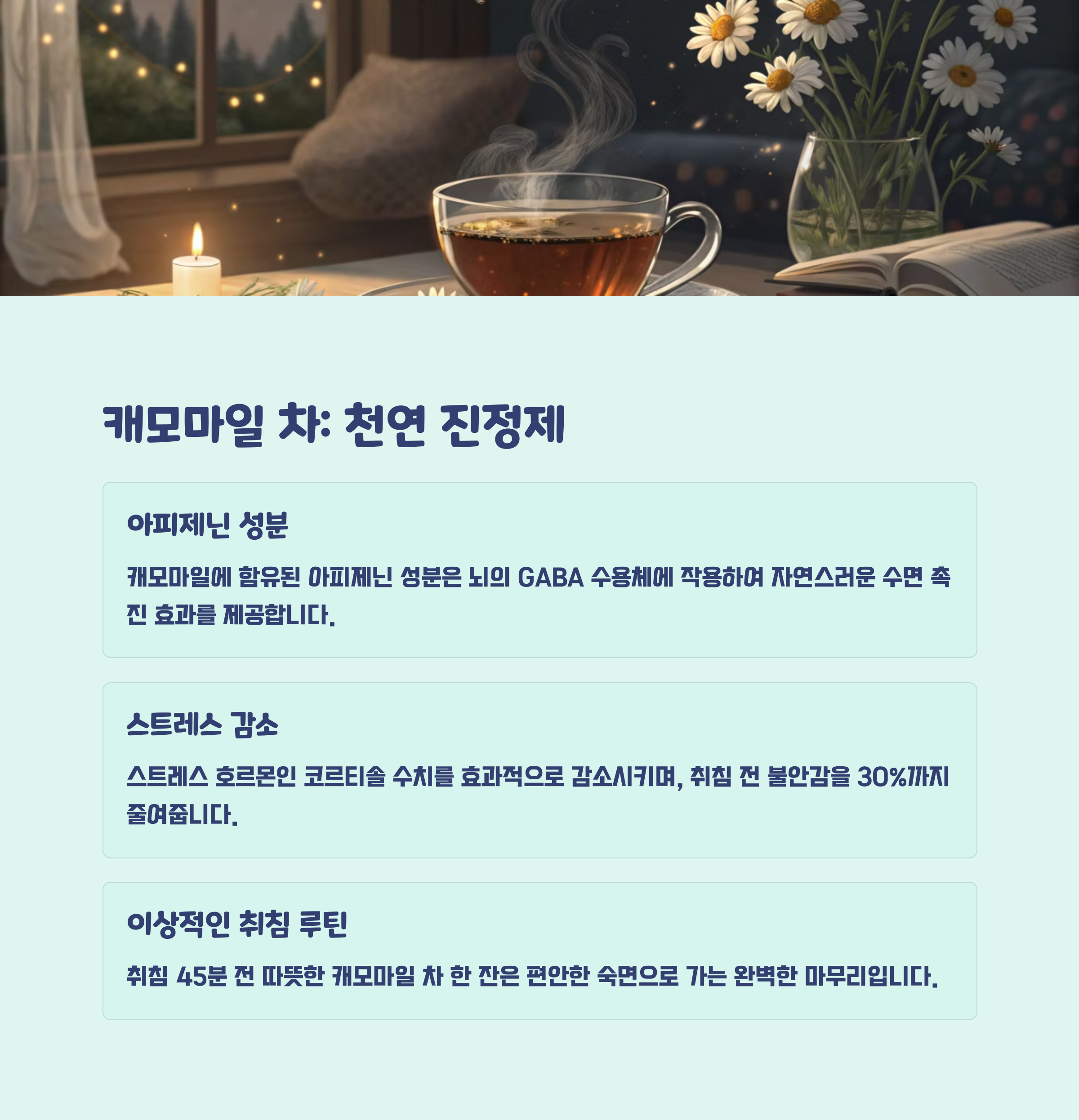 캐모마일 차는 플라보노이드와 아피제닌 같은 항산화 성분을 함유하고 있어 신경계를 진정시키고 스트레스를 완화시킵니다. 자기 전에 한 잔의 따뜻한 캐모마일 차를 마시면 긴장이 풀리고 편안한 잠자리를 마련할 수 있습니다.
