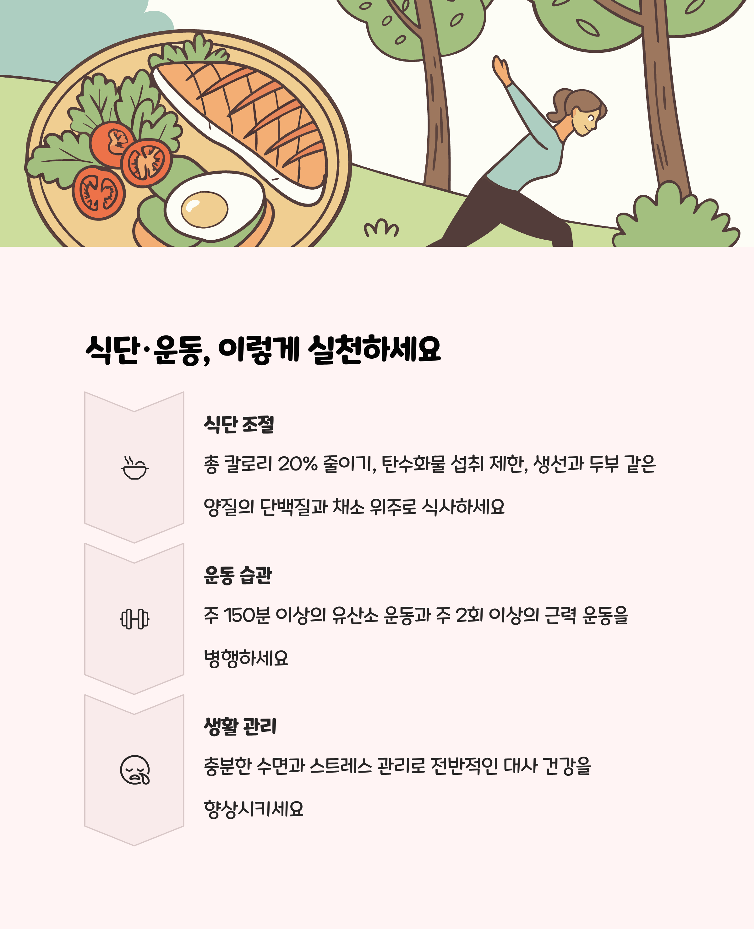 - 일주일에 150분 이상(주 3~5회) 중등도 유산소 운동 + 근력운동 병행이 효과적.