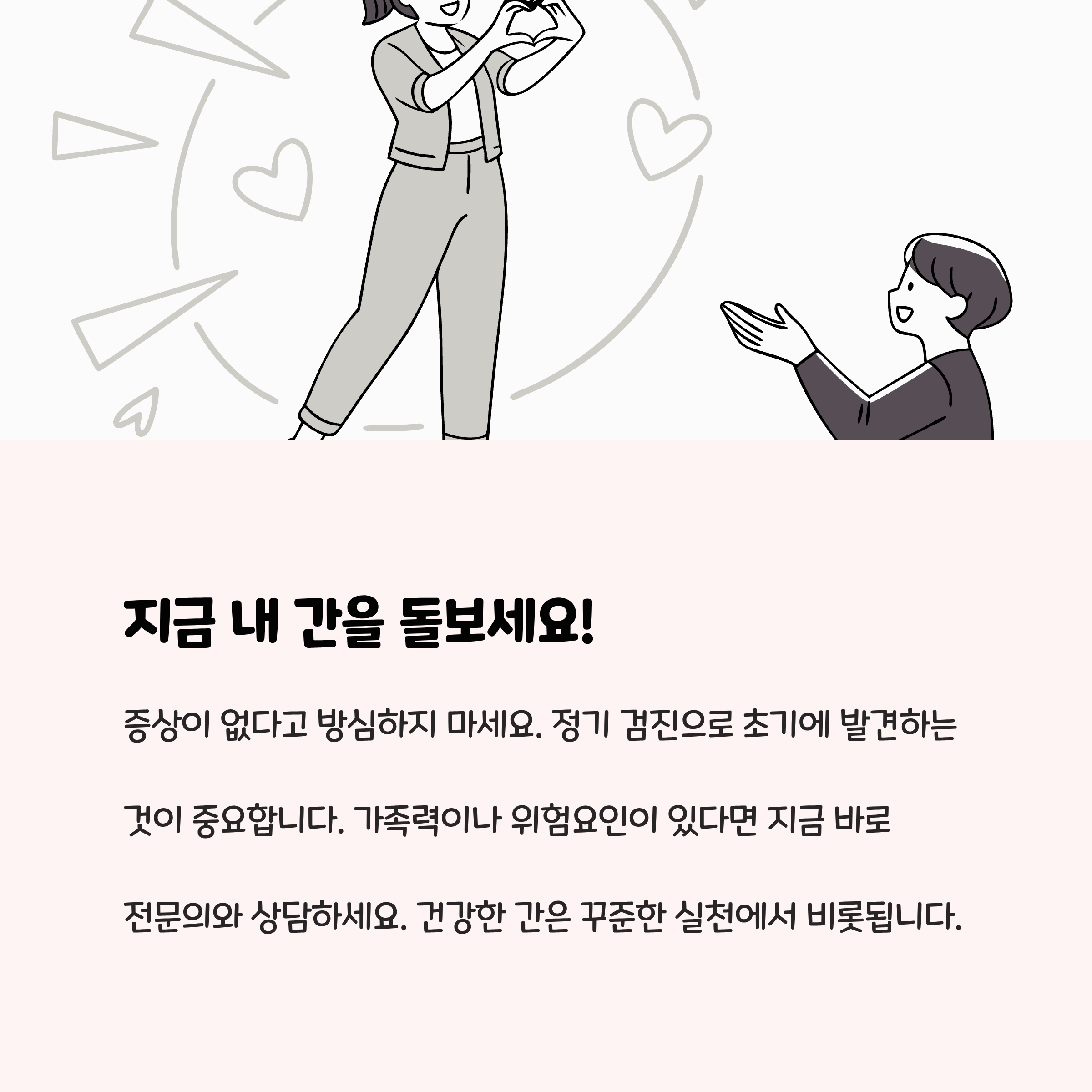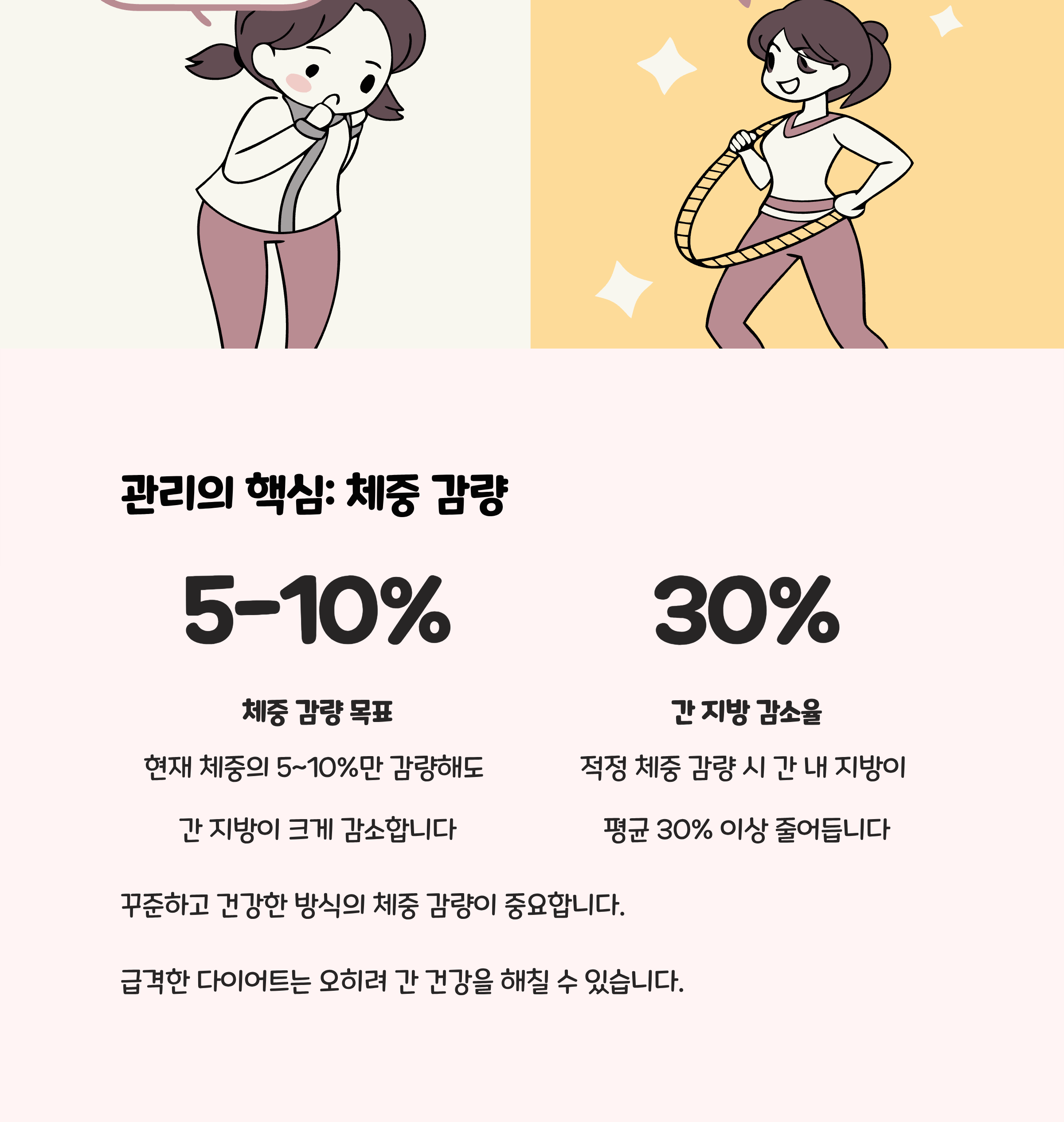 - 현재 체중의 5~10%만 감량해도 간 내 지방, 간효소 수치가 뚜렷이 개선됩니다.