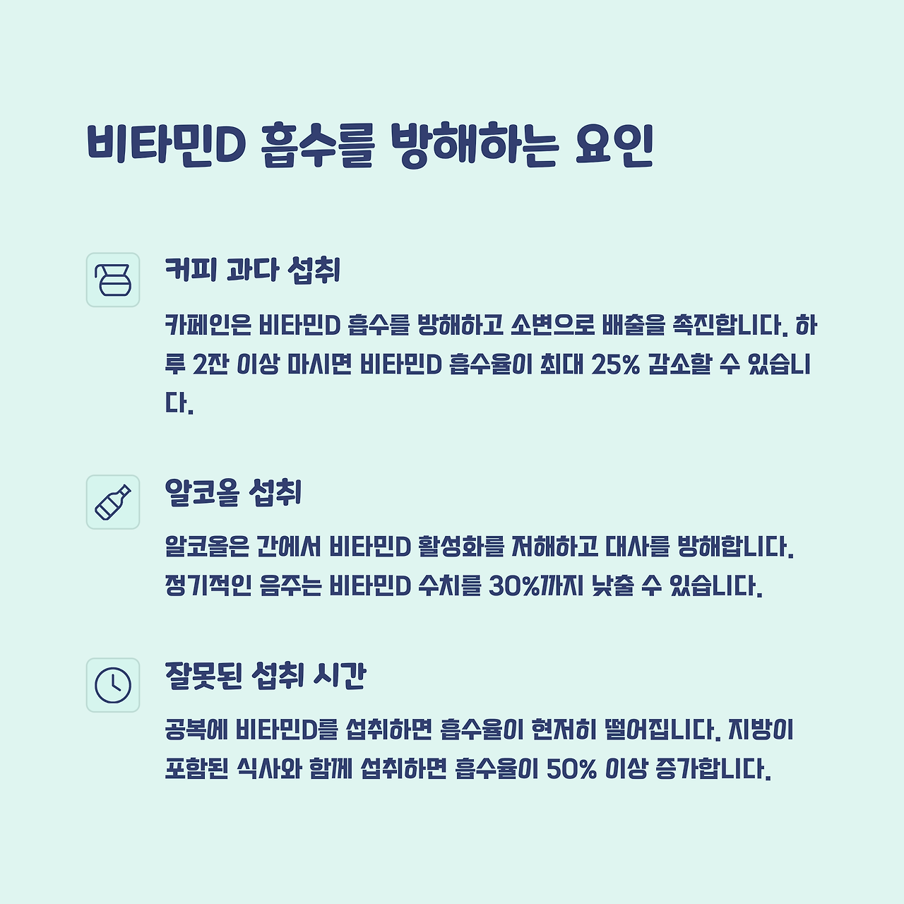 - 커피 (150ml) 섭취 시 2시간 내 비타민D 흡수율 17% 감소