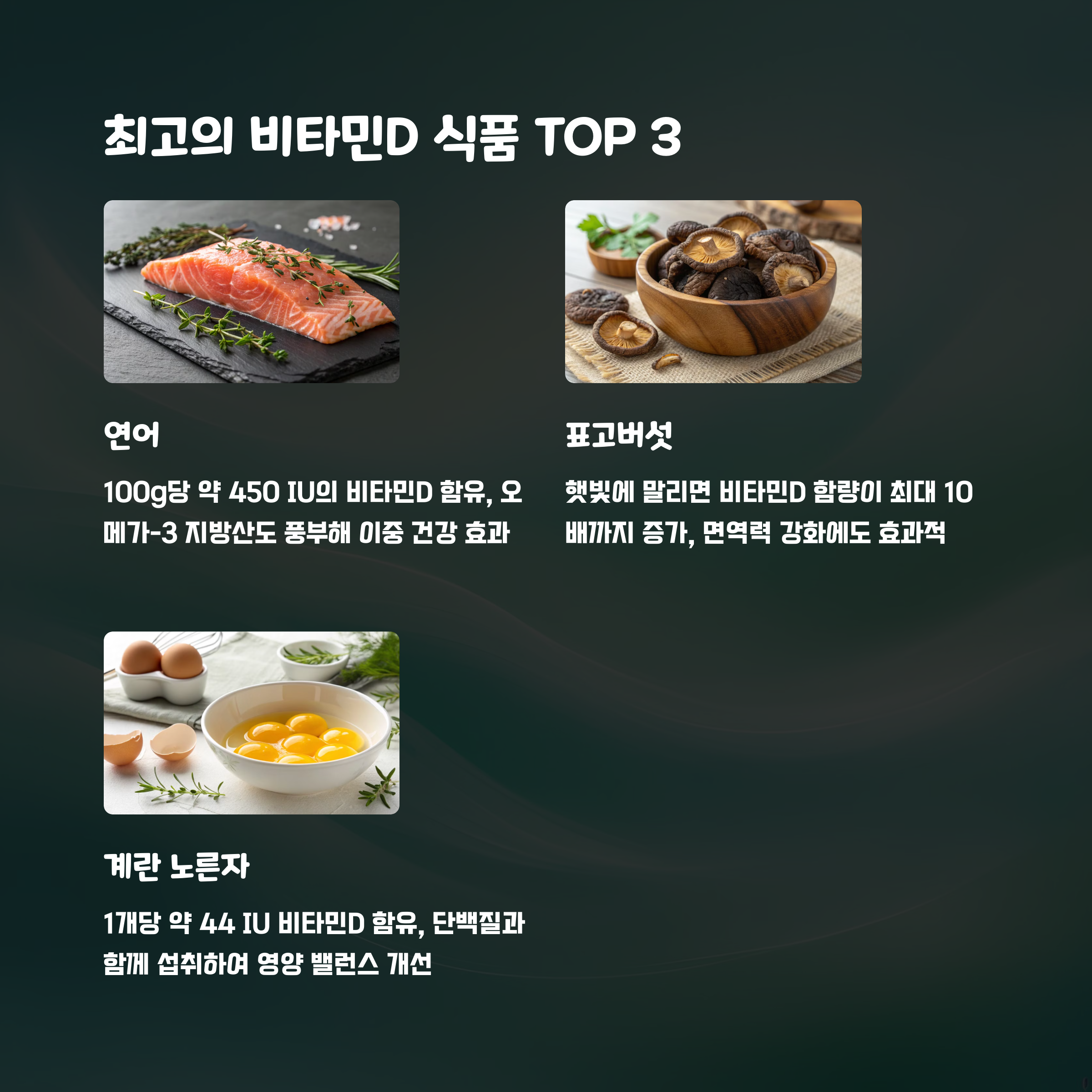 | 고등어구이(1마리) + 표고버섯볶음(70g) | 동물성D3 + 식물성D2 | 총 비타민D 650IU |