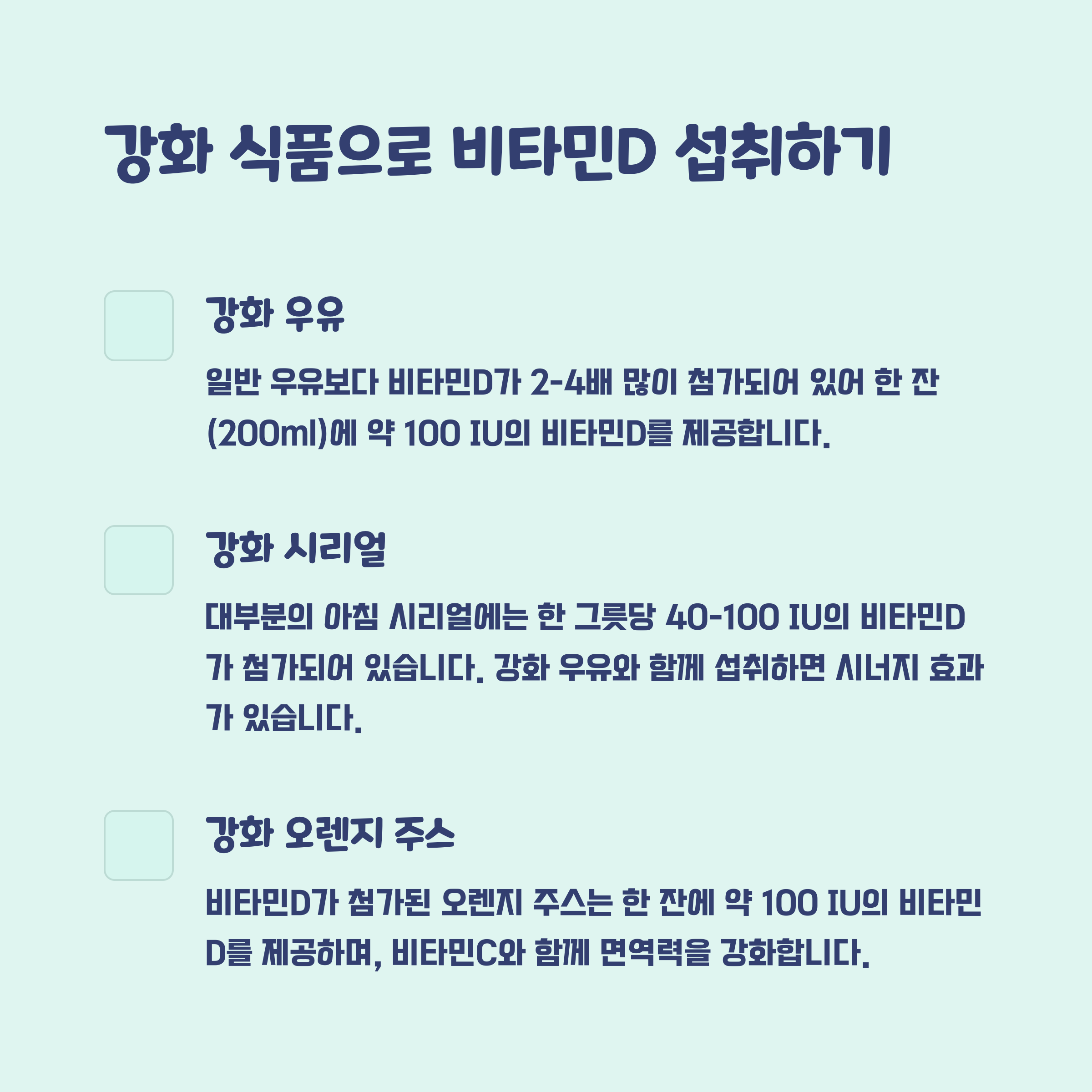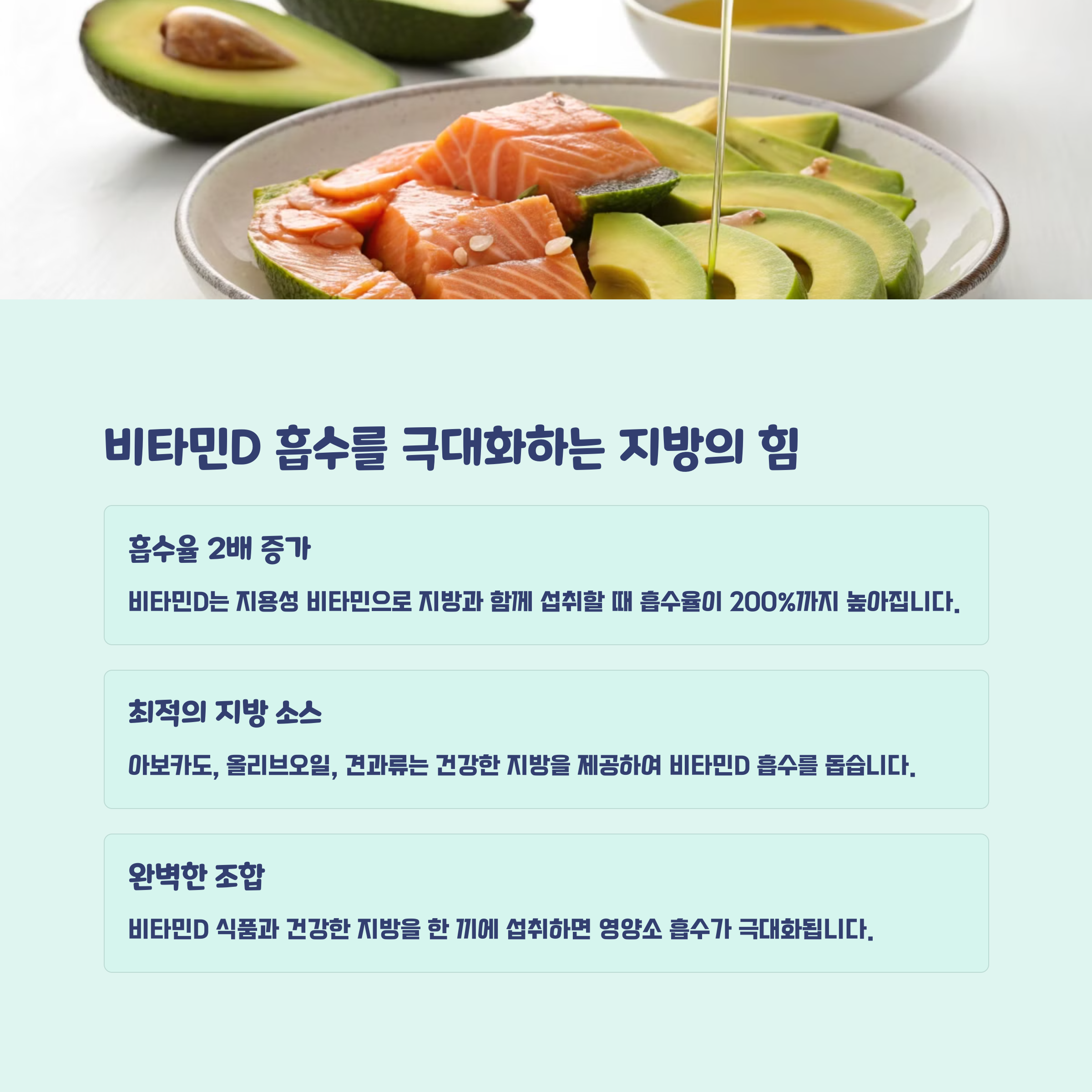 - 지방 : 아보카도 1/4개(50g) 또는 올리브오일 1티스푼(5ml) → 지용성 비타민D 흡수 촉진