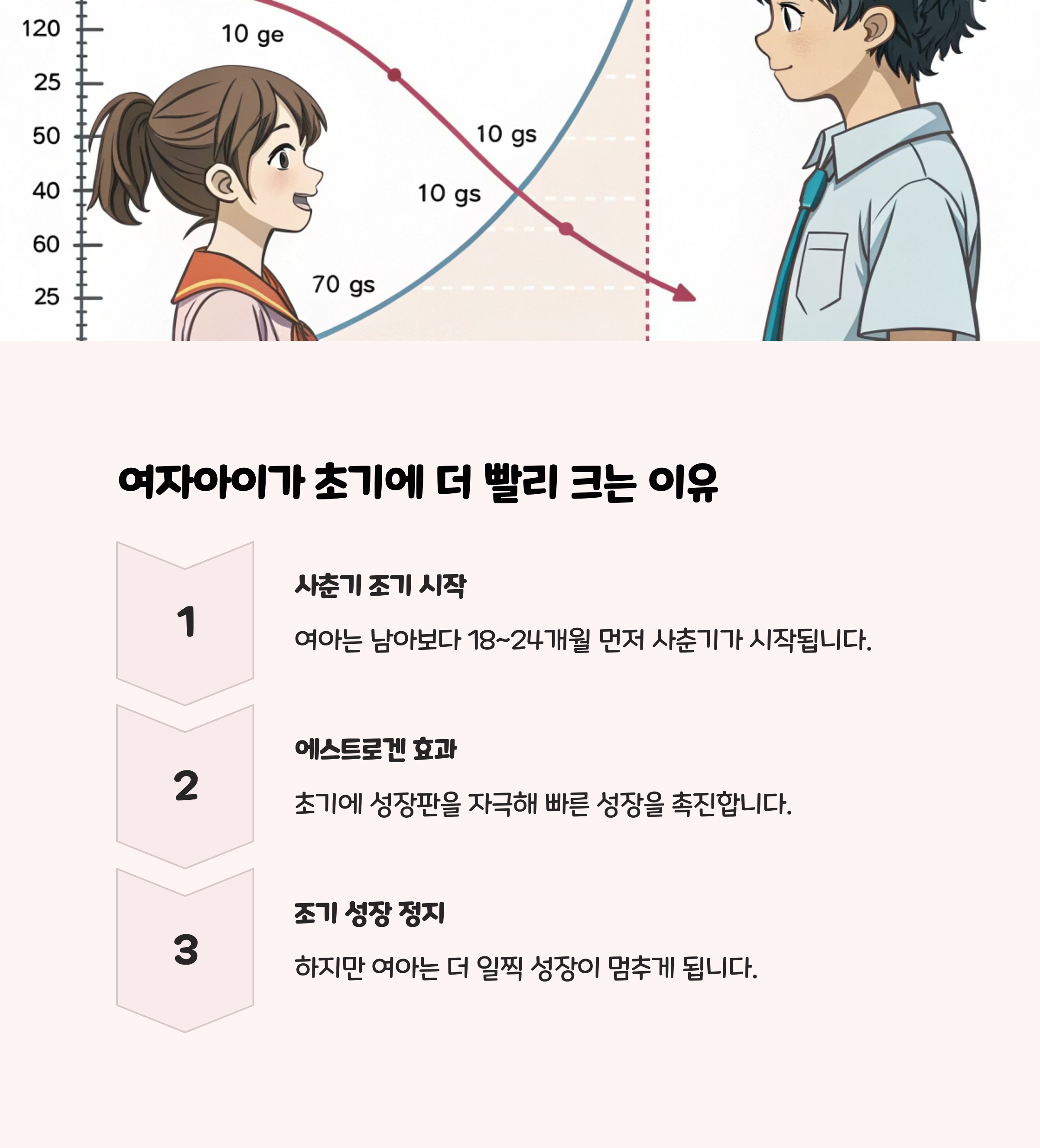 여아는 초등학교 4~5학년, 남아는 초등 6학년~중학교 1학년 무렵이 급성장기입니다. 이 시기에는 1년에 7~9cm까지 성장할 수 있으므로, 영양과 수면, 운동을 특히 신경 써야 합니다.