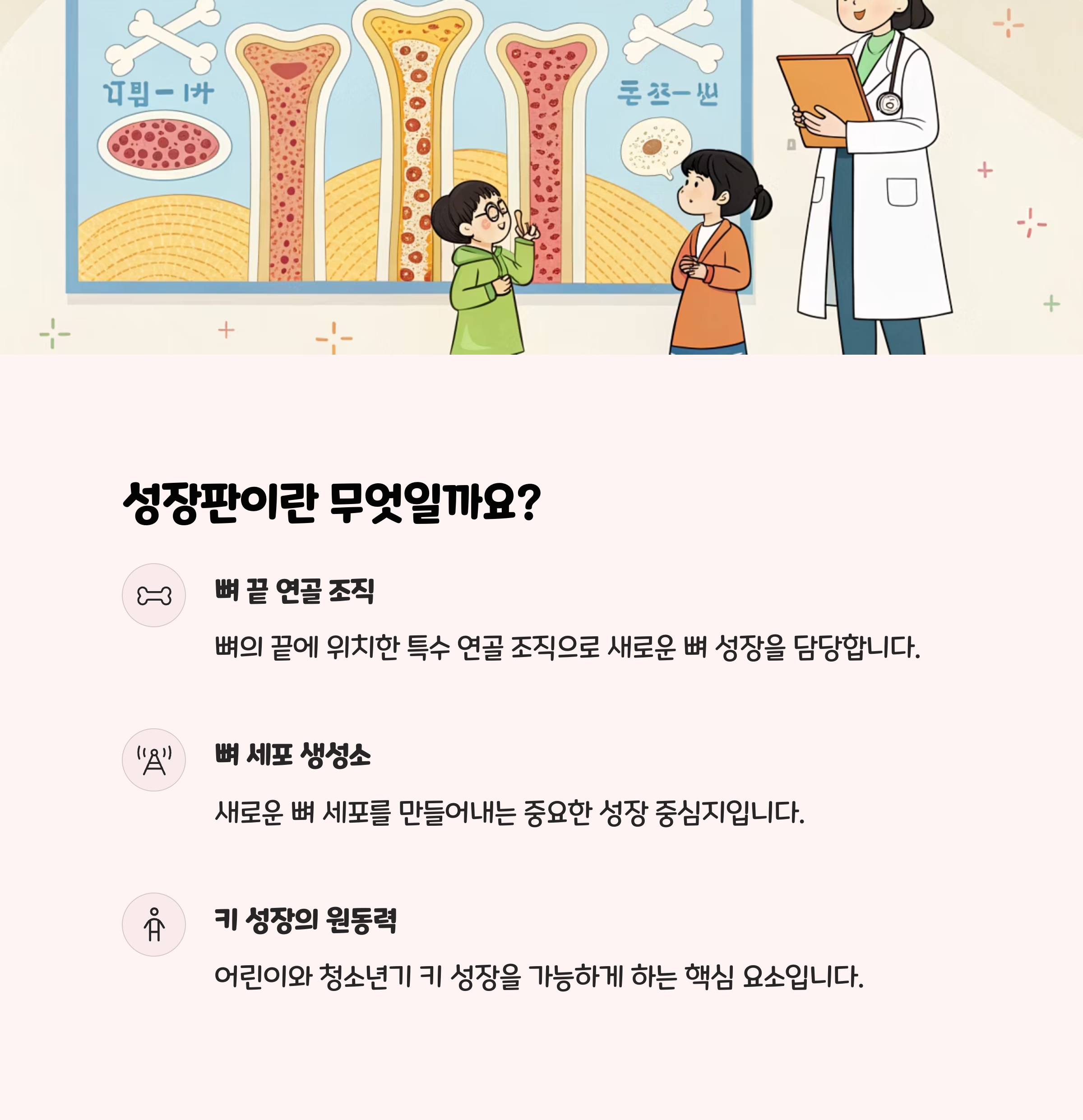 성장판은 뼈의 양 끝에 위치한 연골 조직으로, 뼈가 길어지며 키가 자라는 데 핵심적인 역할을 합니다. 이 부위가 닫히면 더 이상 뼈가 길어지지 않아 키 성장도 멈추게 됩니다. 성장판은 손가락, 발가락, 무릎, 척추 등 다양한 부위에 분포하며, 부위마다 닫히는 시기가 다릅니다.
