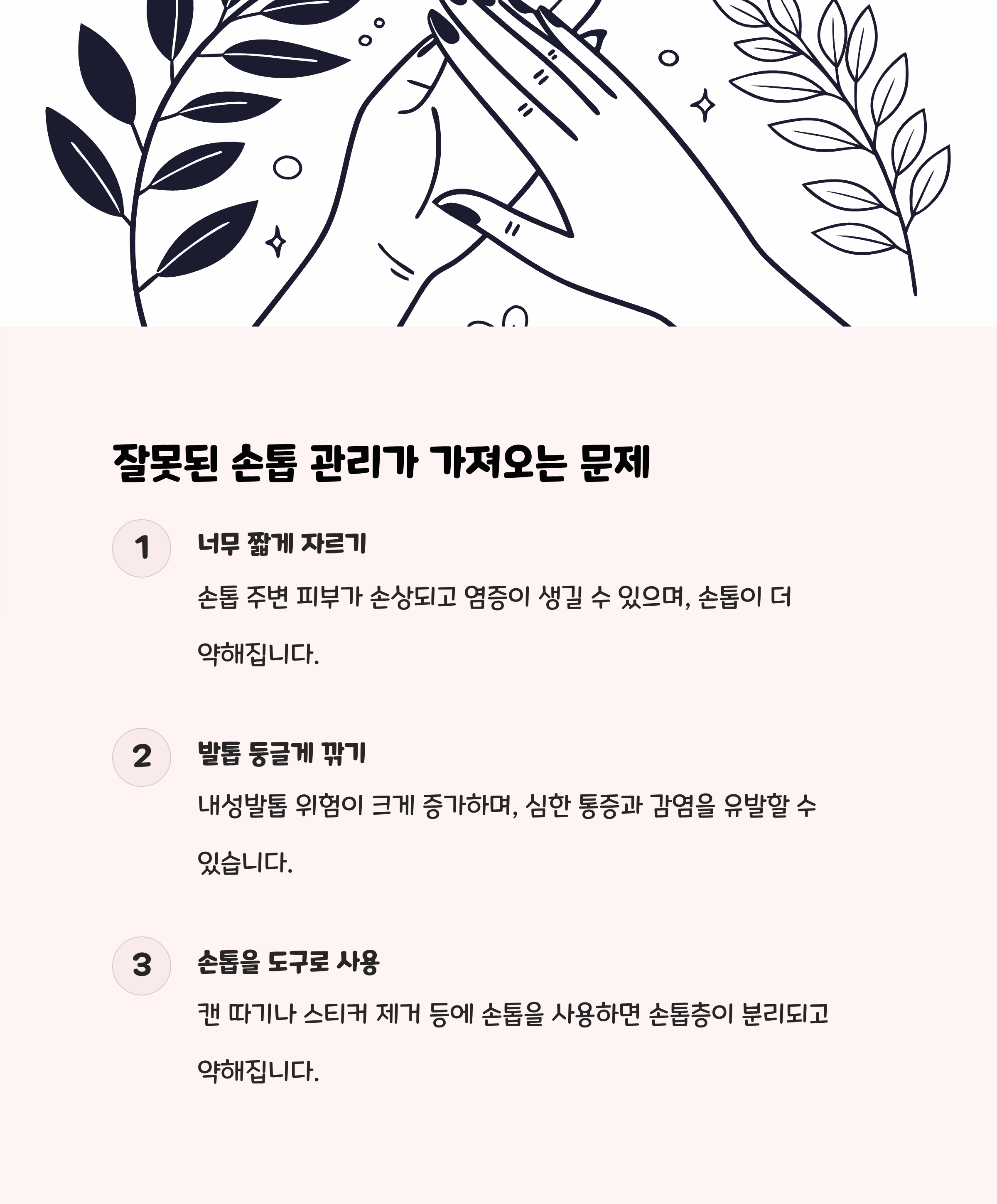 손톱 다듬기: 끝을 둥근 사각형 모양으로 자르는 것이 좋습니다. 뾰족하거나 지나치게 짧게 깎으면 손톱이 부서지기 쉽고 주변 피부 손상을 초래합니다.발톱 관리: 염증 예방을 위해 양 옆을 너무 깊게 깎지 말고, 앞부분과 평행하게 일자로 깎아야 합니다.매니큐어 사용법: 매니큐어는 1주일에 한 번씩 반드시 지우고, 손톱 강화제나 영양제를 바르는 것이 손톱 보호에 효과적입니다. 톨루엔, 포름알데하이드 등 유해 성분이 들어있는 제품은 피하는 것이 좋습니다.수분 유지: 손톱은 모발과 비슷하게 수분량이 중요하여, 건조하면 갈라짐과 부서짐이 심해집니다. 핸드크림이나 전용 영양제로 꾸준히 보습하고, 손톱 주변 큐티클 관리에도 신경 써야 합니다.손톱 휴식 주기: 매니큐어나 네일 아트를 지속적으로 하면 손톱에 부담이 되므로 충분한 휴식 시간을 주는 것이 좋습니다.