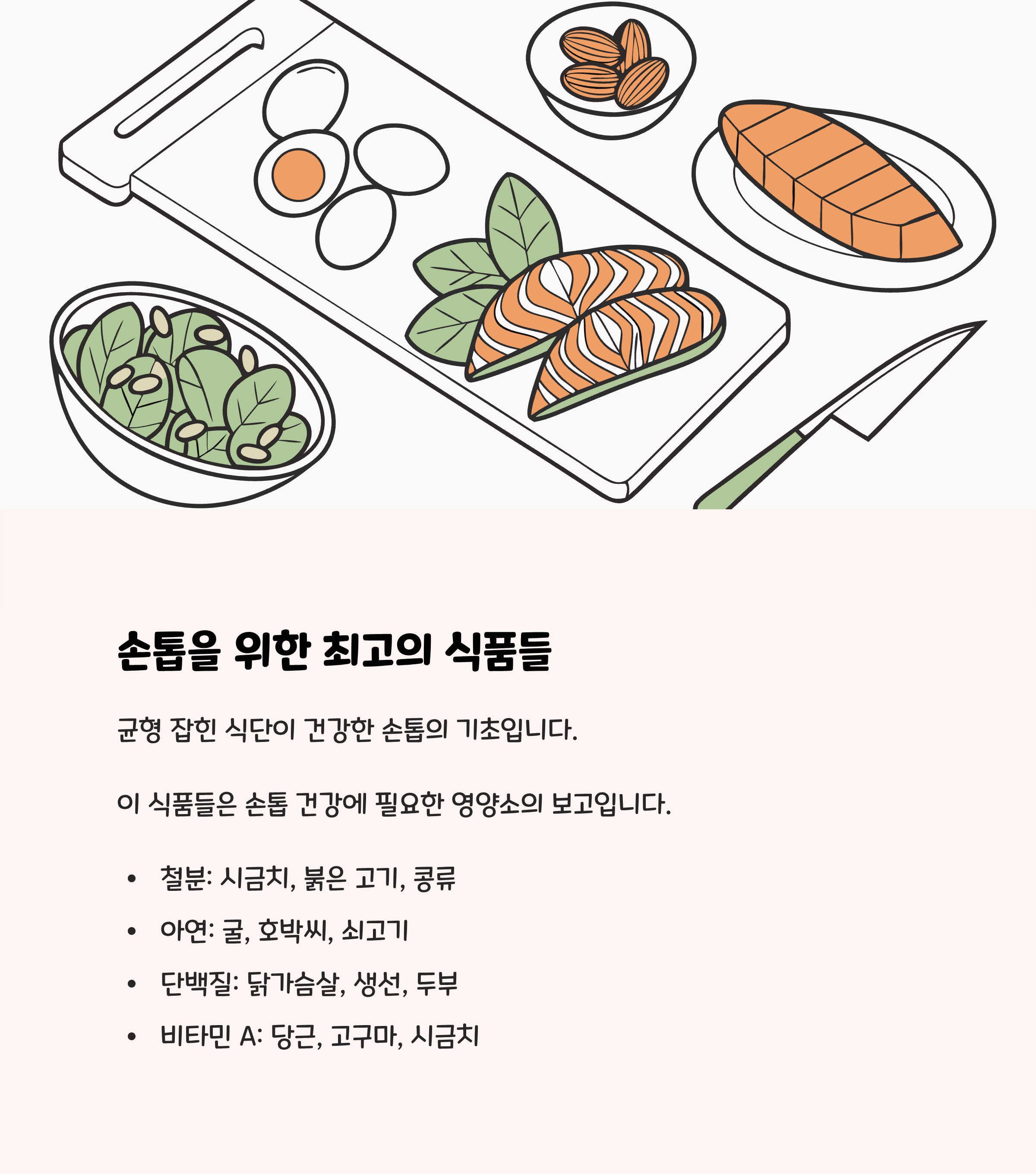 손톱은 주로 단백질인 케라틴으로 이루어져 있어, 이 단백질의 충분한 합성을 돕는 영양소 공급이 가장 중요합니다. 특히 비오틴(비타민 B7), 철분, 비타민 A와 D가 주요 역할을 합니다.