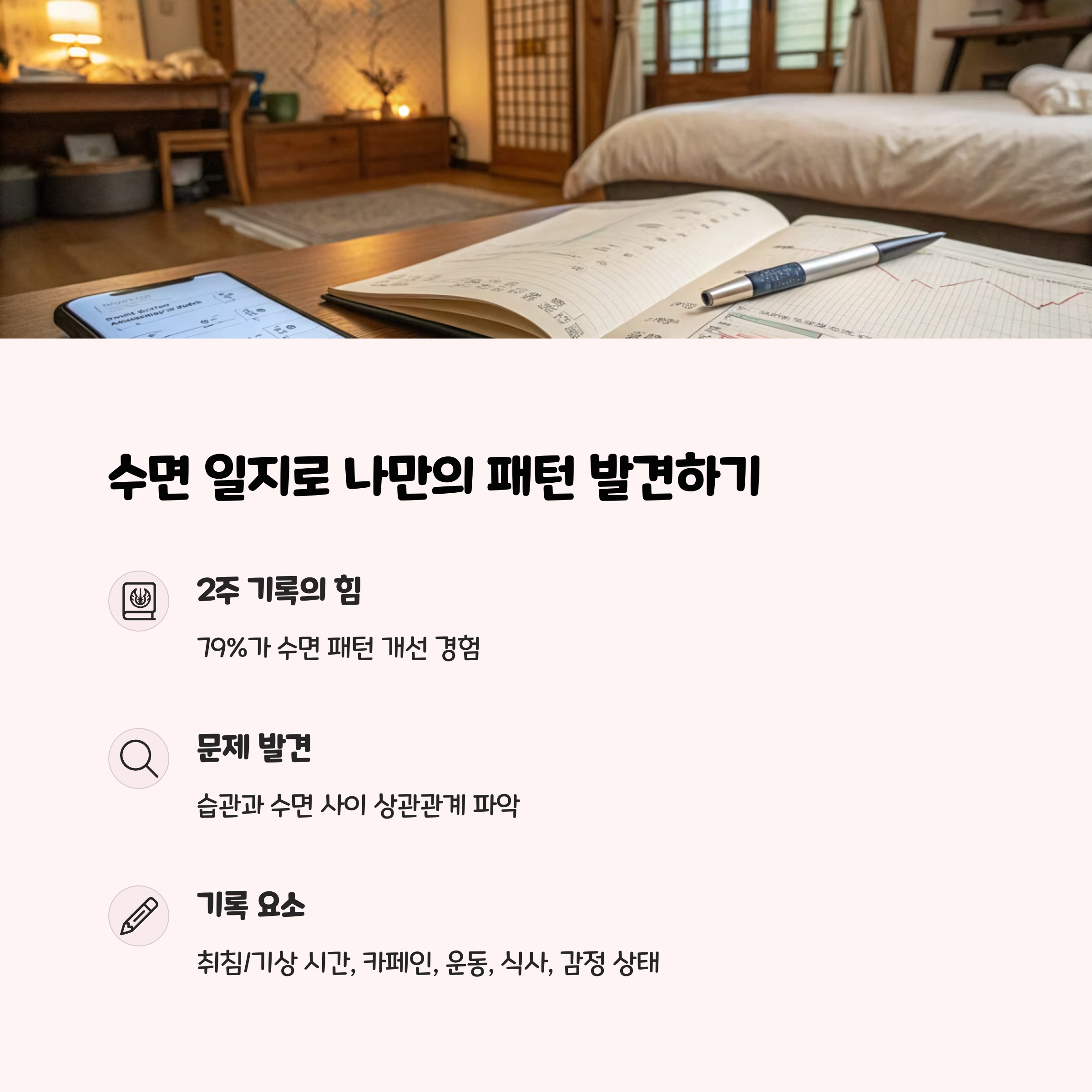 | 4. 수면 패턴 기록 | 수면 일지 작성, 문제점 파악 | 일주일 2~3회 기록, 개선점 체크 |