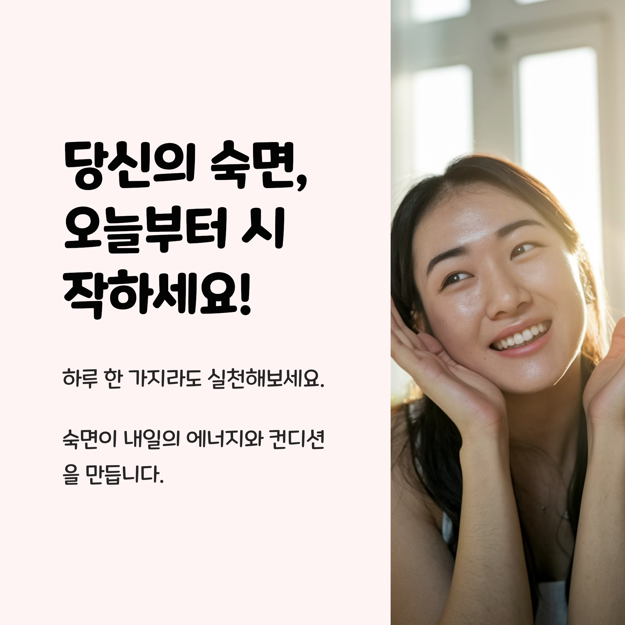 - 저녁 식사와 운동 : 과식, 야식, 매운 음식, 고지방 음식은 소화에 부담을 주어 수면을 방해합니다. 저녁 식사는 잠들기 최소 3시간 전에 마치고, 가벼운 산책이나 스트레칭 정도의 운동만 하세요. 격렬한 운동은 오히려 각성을 유발할 수 있습니다.