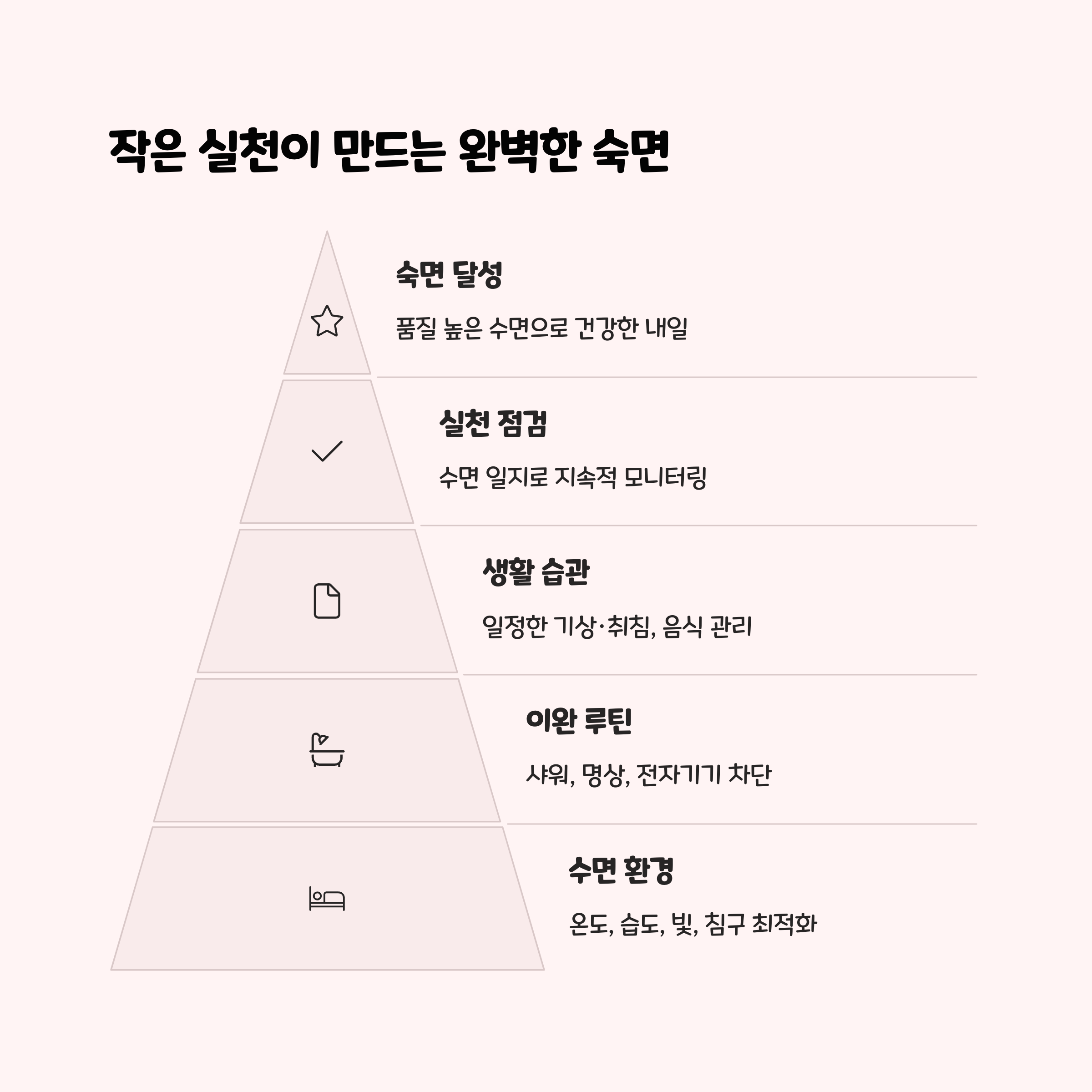 | 1. 침실 환경 세팅 | 온도(16~18℃), 습도(40~60%), 암막커튼, 백색소음, 맞춤 침구 | 계절별 온도·습도 조정, 조명·소음 관리, 침구 교체 |