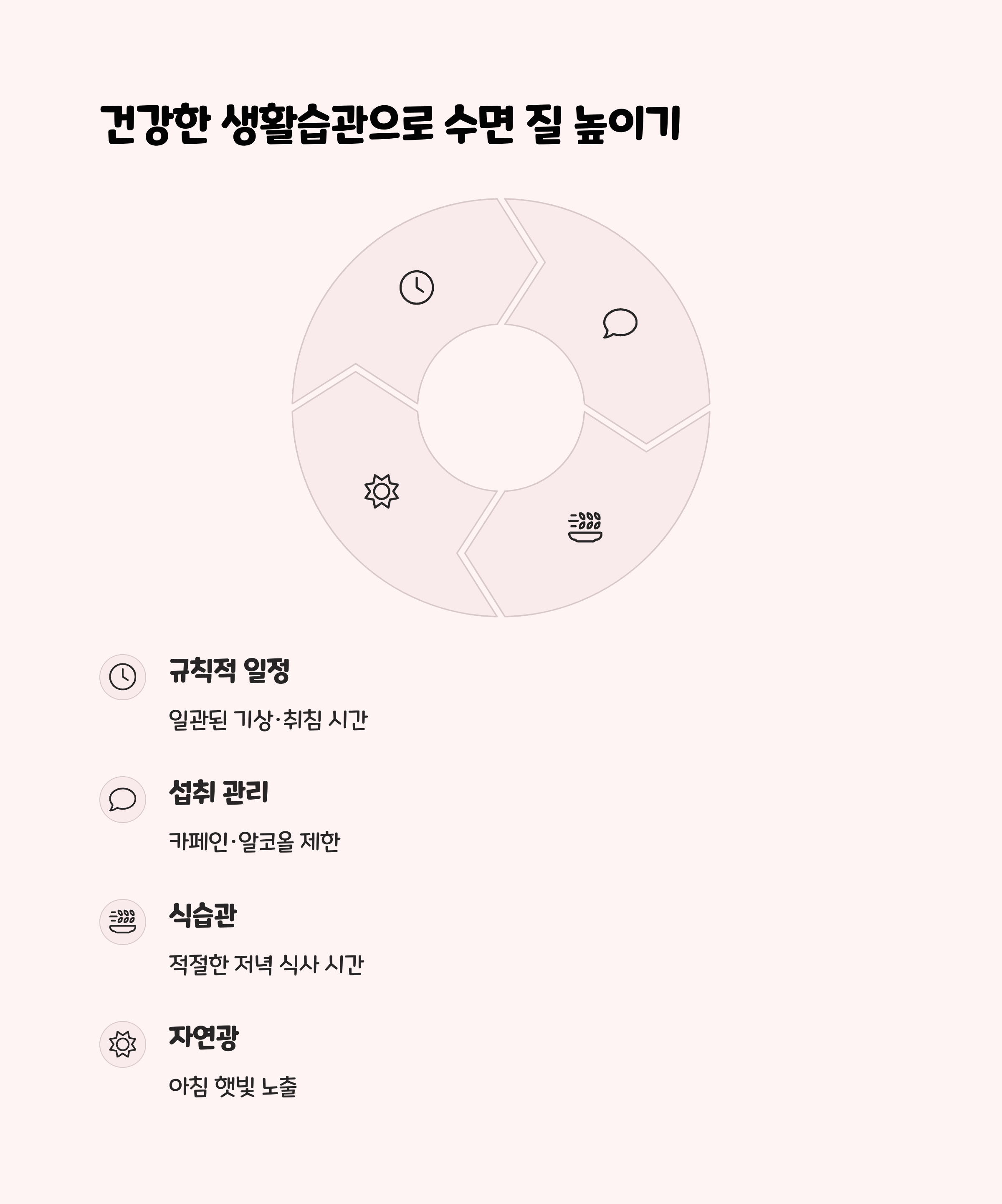 | 3. 생활습관 리셋 | 일정한 취침·기상, 카페인·알코올 제한, 저녁 식사·운동 조절 | 주말 포함 일정 유지, 오후 4시 이후 카페인 금지 |