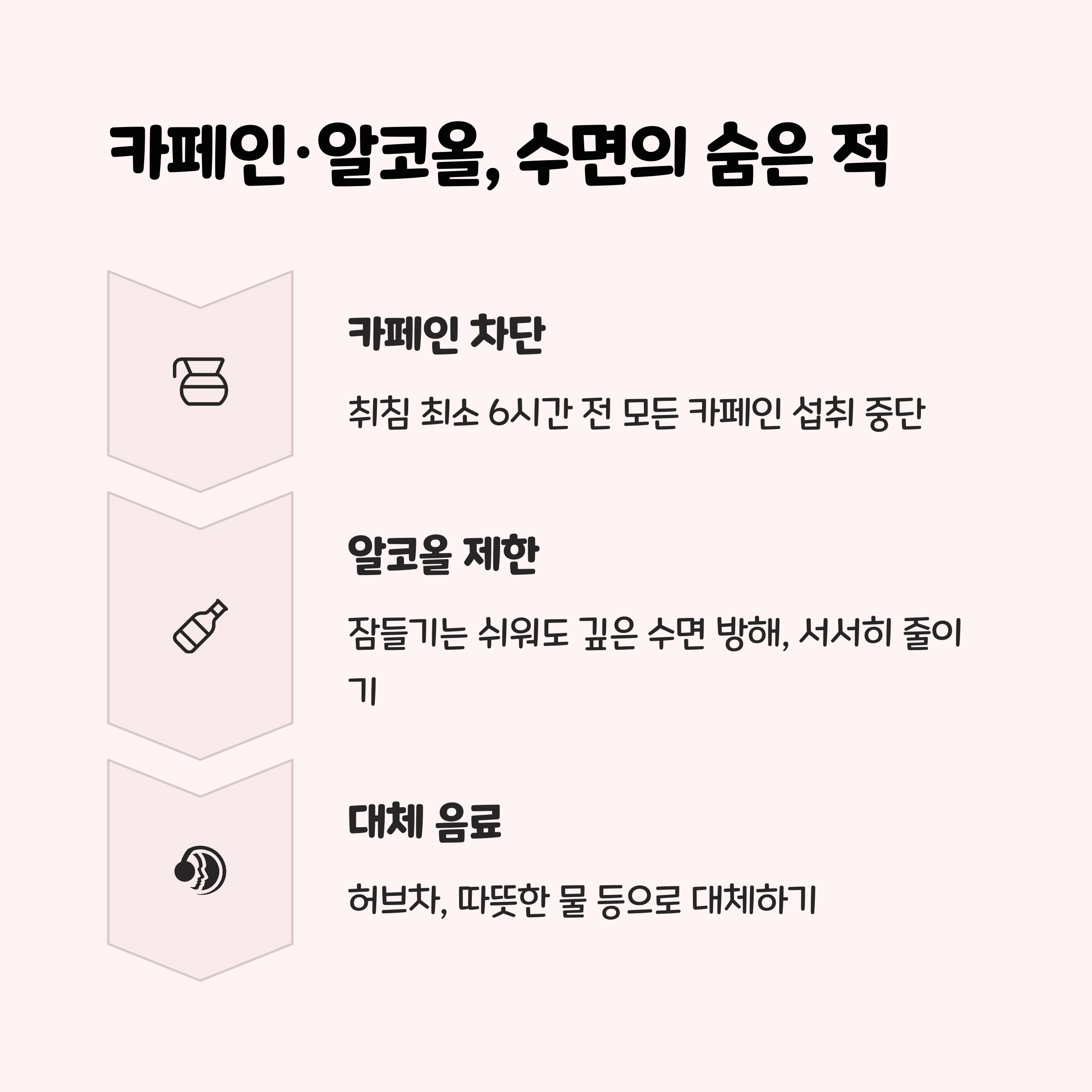 - 카페인·알코올 제한 : 오후 4시 이후에는 커피, 차, 초콜릿 등 카페인 섭취를 피하고, 알코올도 삼가세요. 알코올은 잠이 빨리 드는 것처럼 보이지만, 실제로는 깊은 잠을 방해하고 자주 깨게 만듭니다.