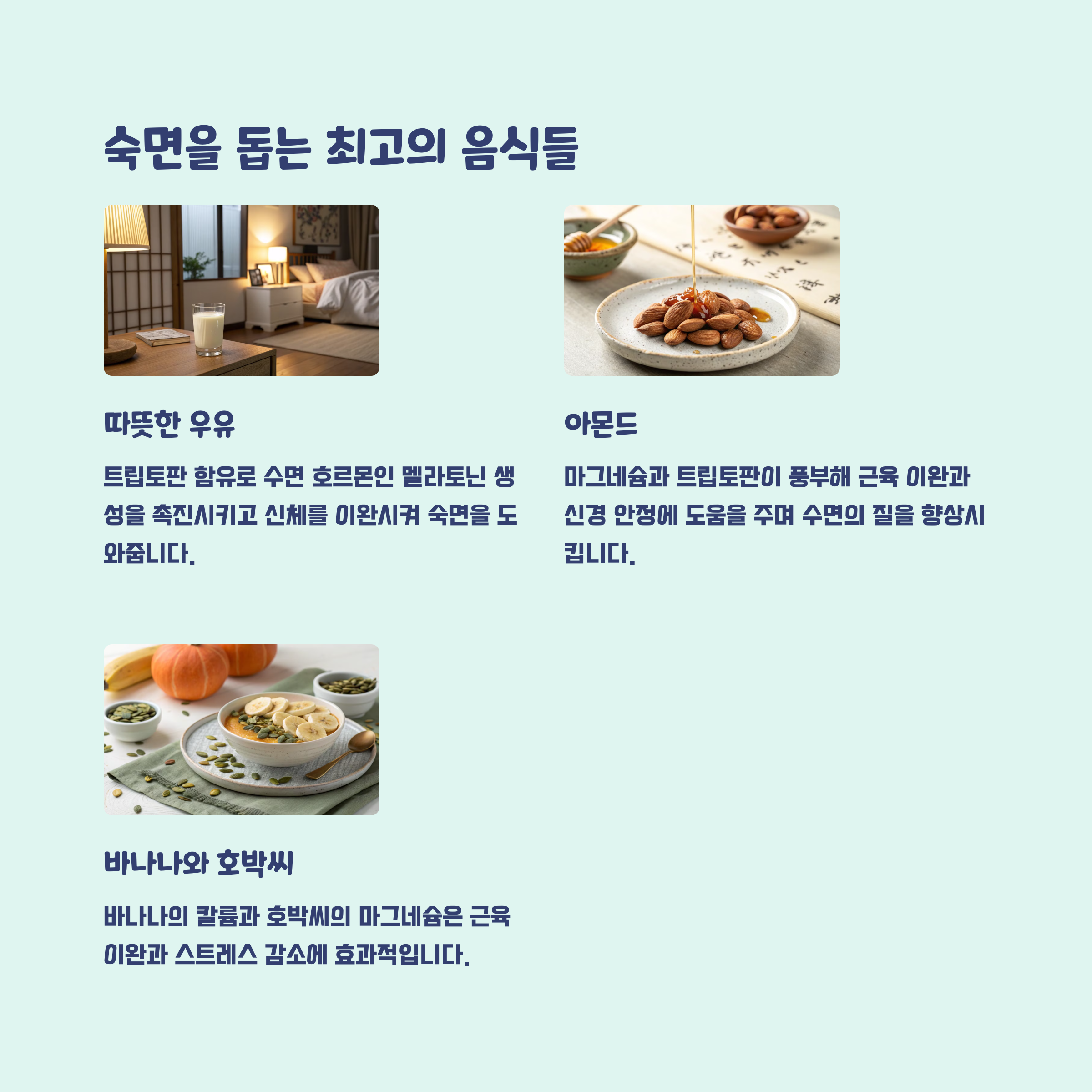 아몬드: 멜라토닌과 마그네슘이 풍부해 몸을 이완시킵니다.따뜻한 우유: 트립토판 성분이 숙면 호르몬 생성을 돕습니다.바나나: 신경 안정 효과가 있으며 근육 긴장을 완화합니다.