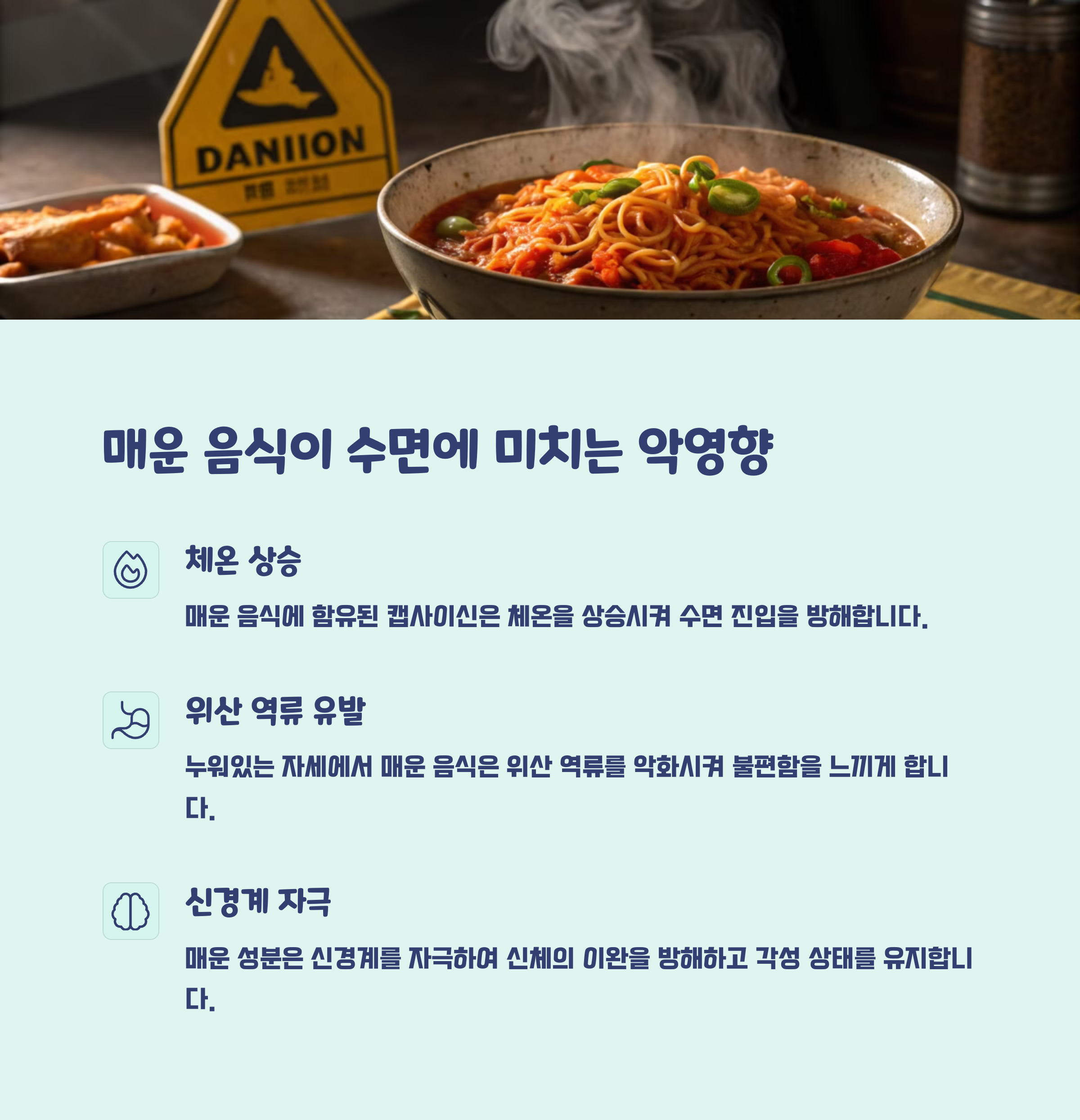 A. 매운 음식은 체온을 상승시키고 위산 분비를 자극하여 속쓰림과 위산 역류를 유발합니다. 특히, 캡사이신 성분은 체온 조절을 방해해 깊은 잠에 들기 어렵게 만듭니다. 또한, 누운 자세에서 이러한 증상이 악화되어 수면의 질을 낮춥니다.