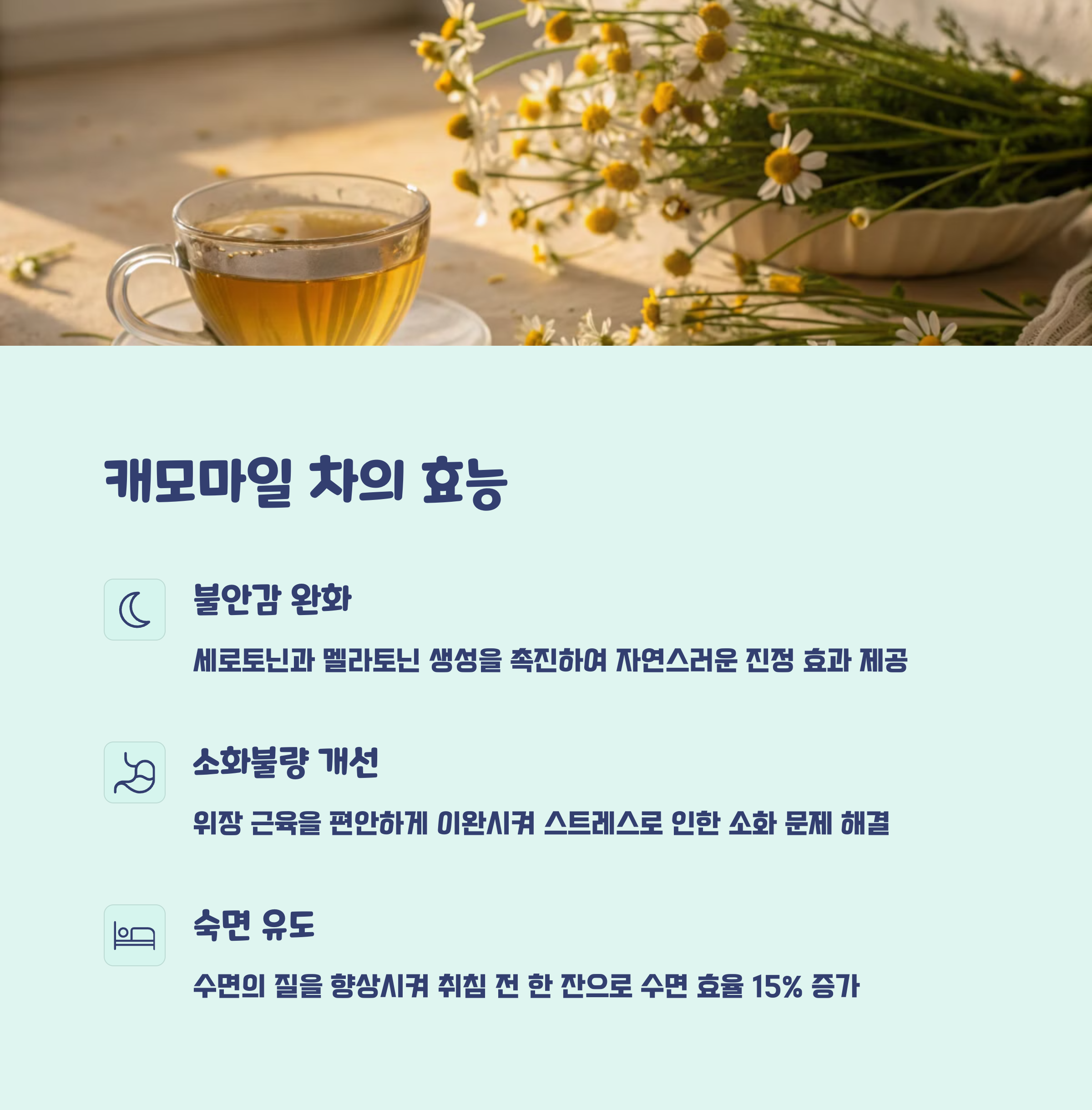 - 추천 팁: 따뜻한 물에 캐모마일 티백을 넣고 5분간 우려낸 후 꿀을 첨가하면 더욱 깊은 풍미와 함께 긴장 완화 효과를 높일 수 있습니다.