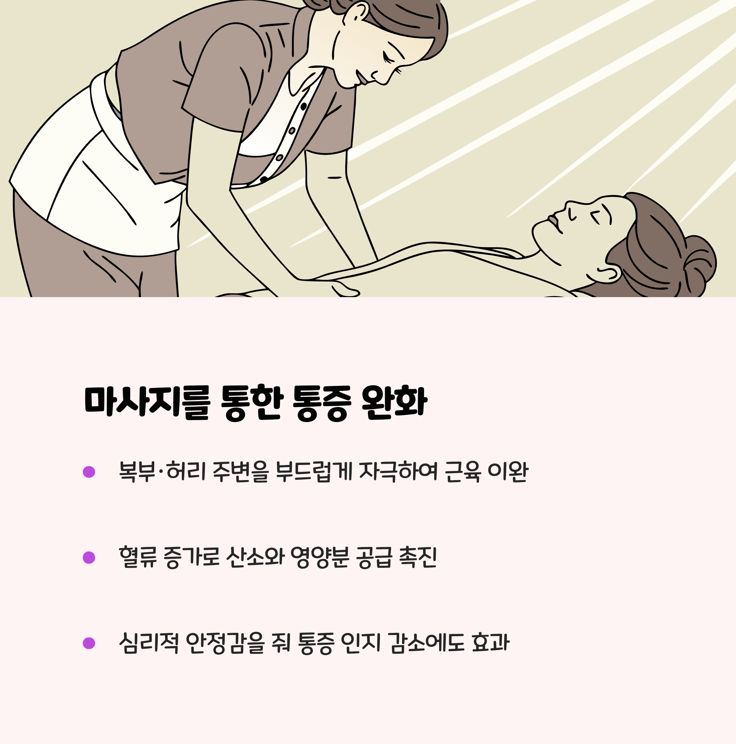 | 마사지 | 근육 이완, 통증 완화 | 아랫배·하부 허리 천천히 문지르기 |