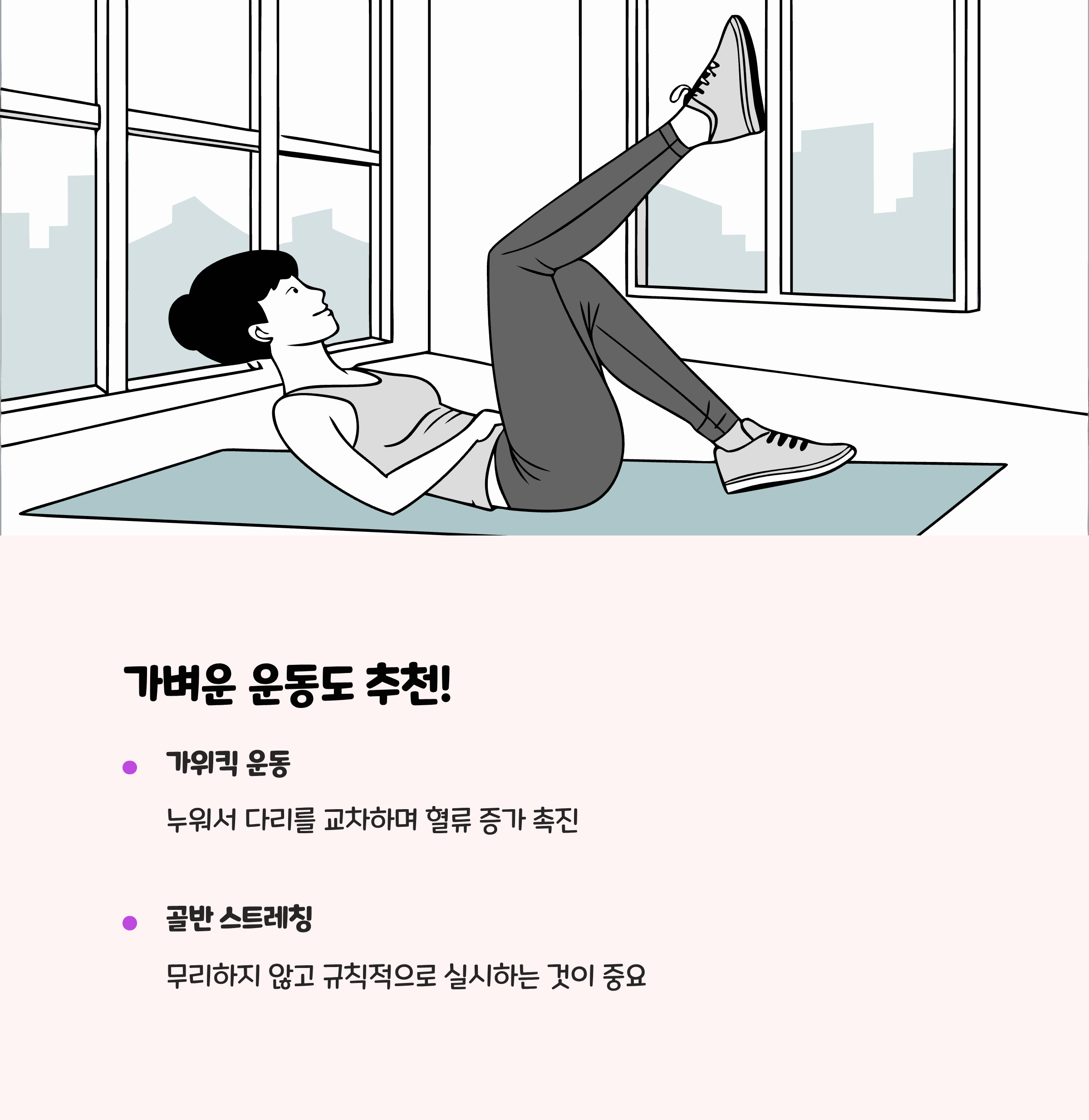 가벼운 운동의 힘: 하복부 강화에 좋은 동작(예: 가위킥, 쉬운 골반 스트레칭)이나, 단순히 10분 정도 걷기를 해도 통증 빈도와 강도가 줄어듭니다.