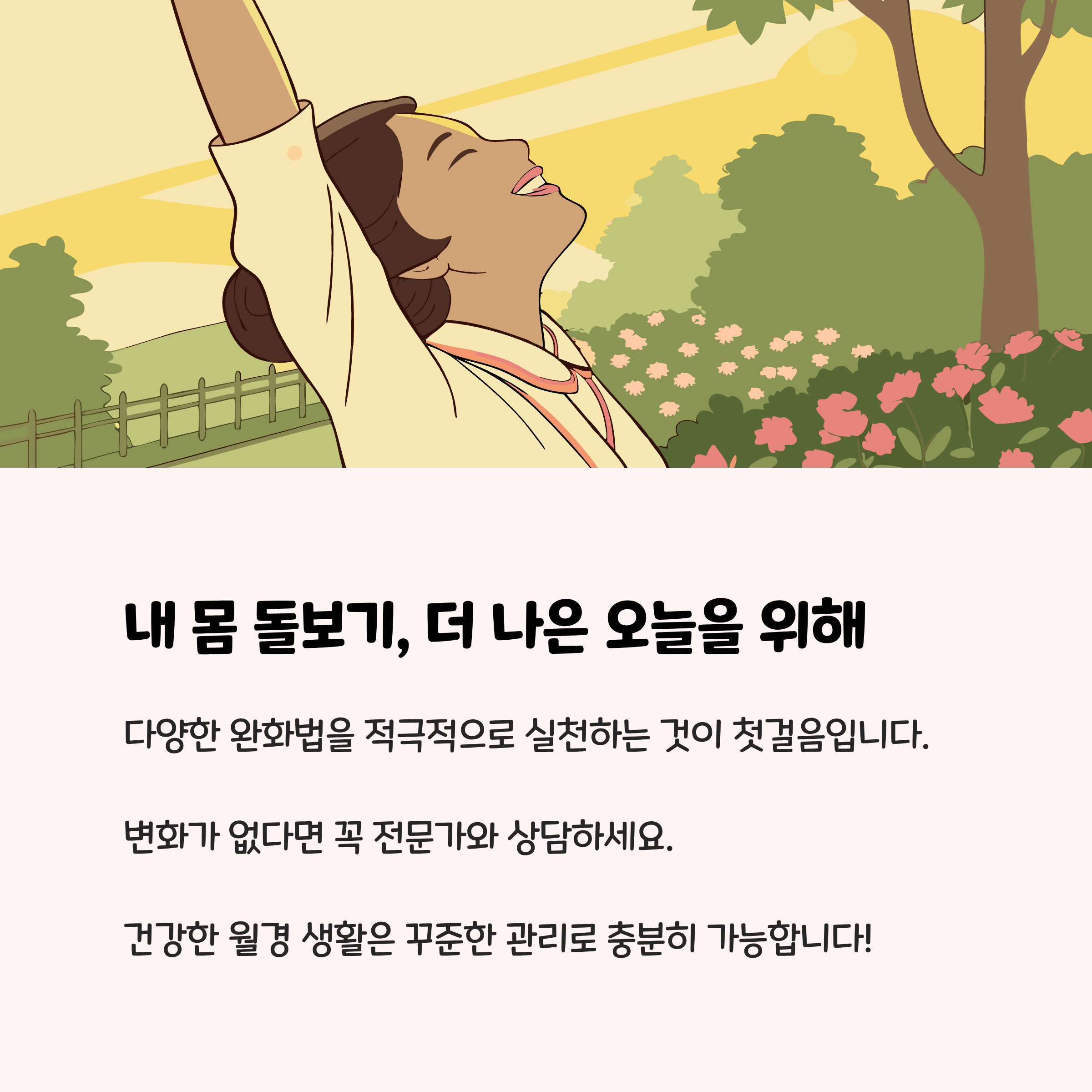 | 가벼운 활동/스트레칭 | 자궁 과긴장 해소, 통증 감소 | 걷기·요가 등 지속적 효과 |