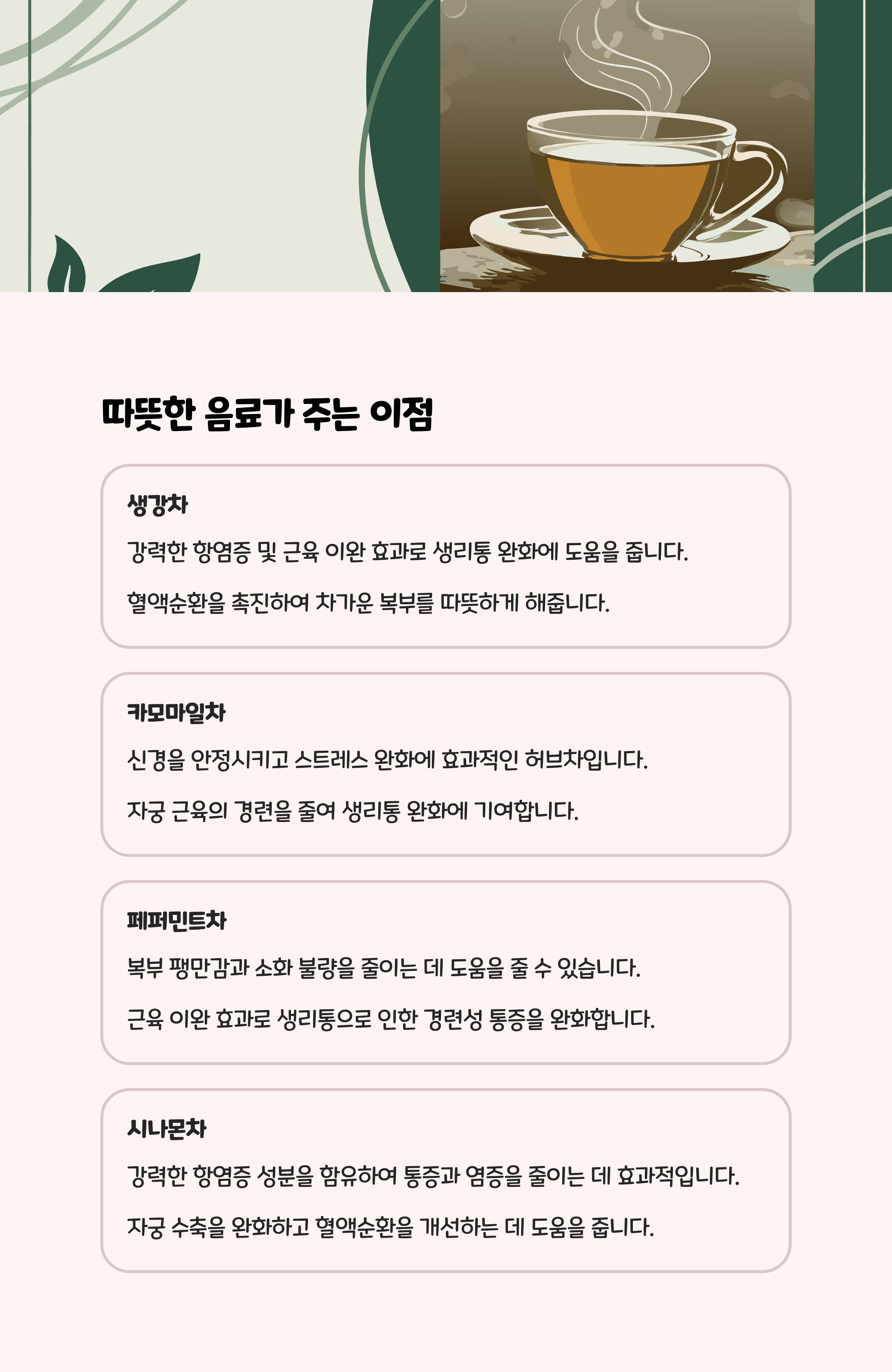 생활 속 습관: 생리 기간에는 너무 차가운 환경, 카페인 또는 자극적인 맛(매운 음식)은 잠시 멀리해주세요.