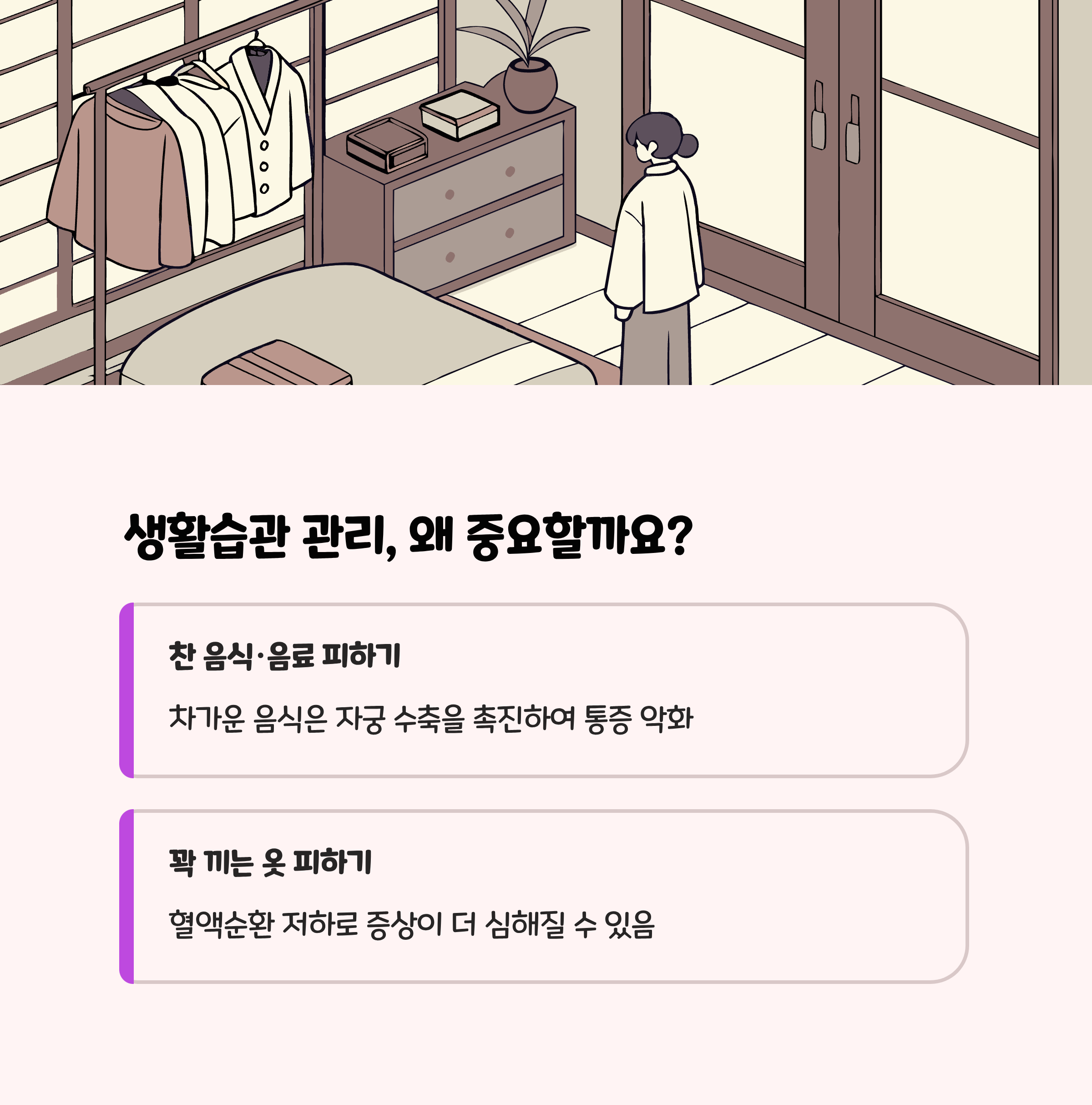 | 옷차림/생활습관 개선 | 꽉 조이는 옷, 찬 음식 피하기 | 체온유지와 혈류순환에 도움 |