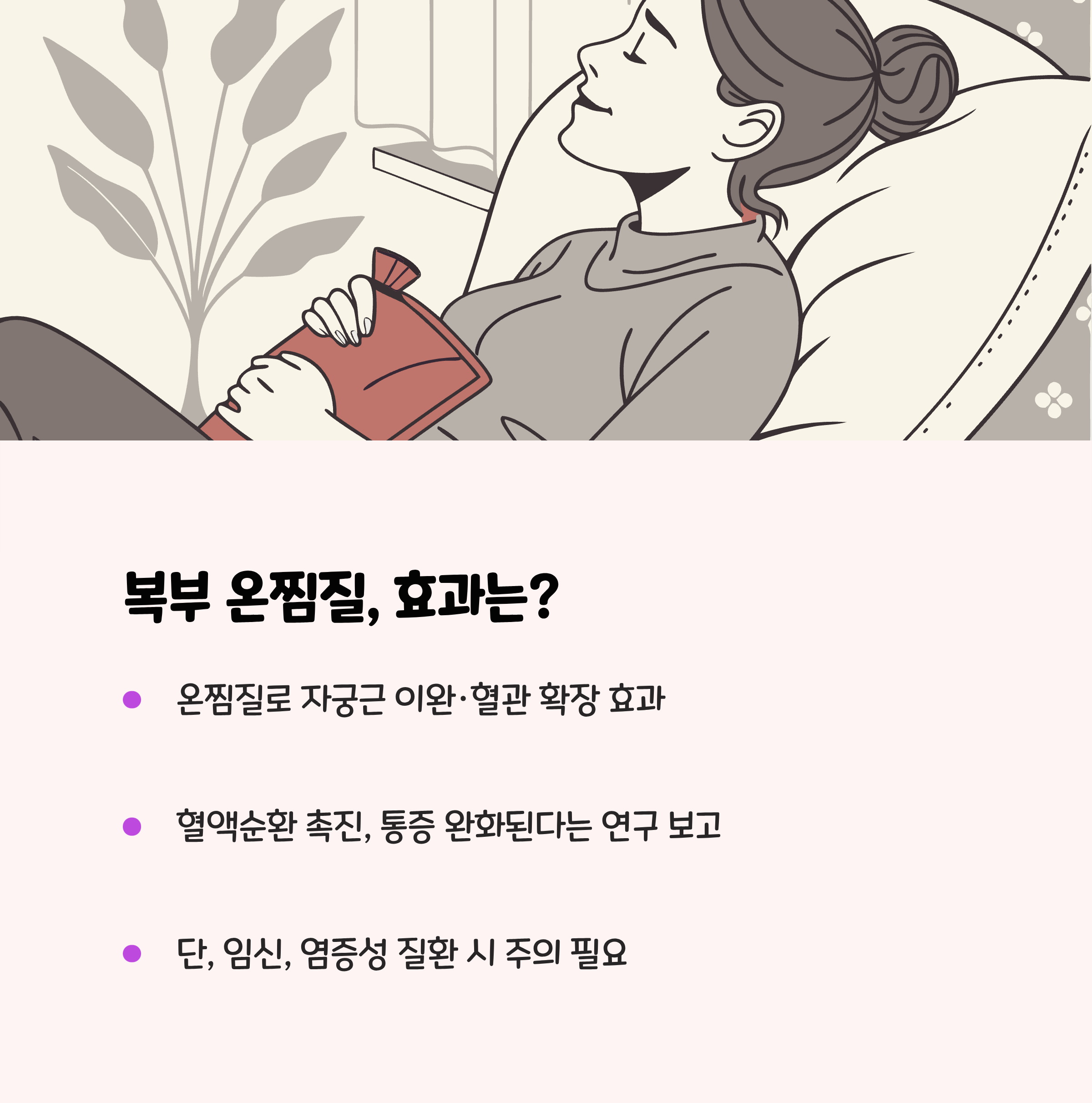 복부를 따뜻하게 하기: 온찜질팩, 따뜻한 수건, 핫팩 사용. 전기장판 활용 시 중간 온도 이상으로 길게 두지 않고 15~20분씩 나눠서 반복하면 효과적입니다.