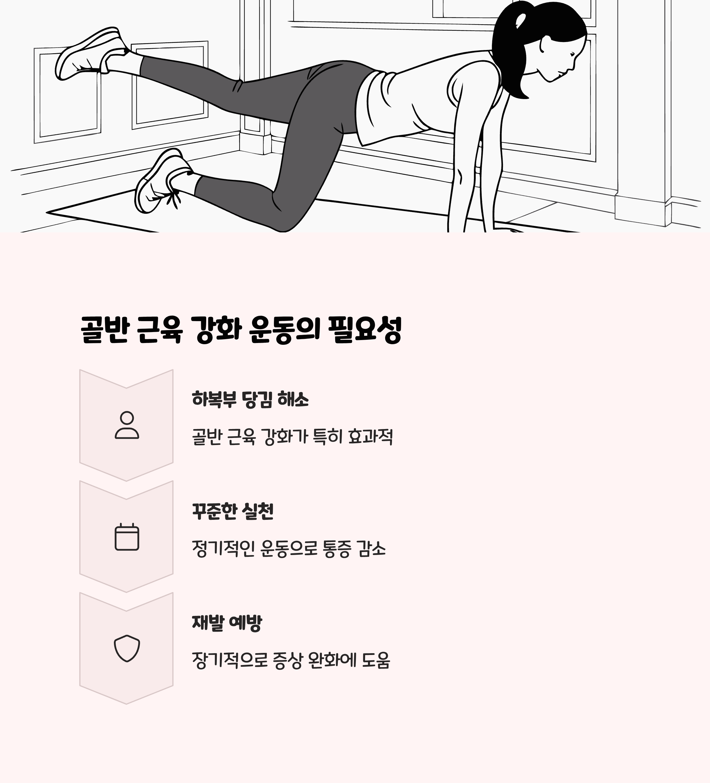 하복부 당김이 심할 때는 바닥에 누워 다리를 가볍게 들었다 내렸다 하는 '가위킥' 동작이나, 무릎을 세우고 두 팔로 감싸 포근하게 안는 '복부 이완 자세'가 효과적입니다. 하루 세 번, 각각 5분 정도 꾸준히 실천해 보세요. 골반 중심 근육이 살아나면서 허리 부담도 줄일 수 있습니다.