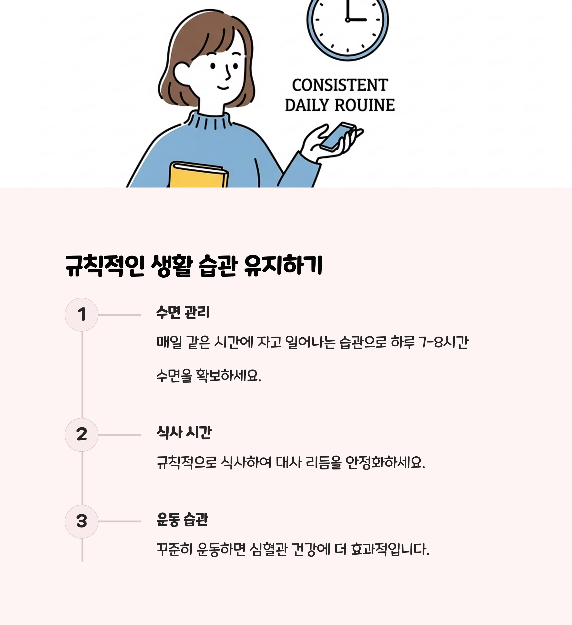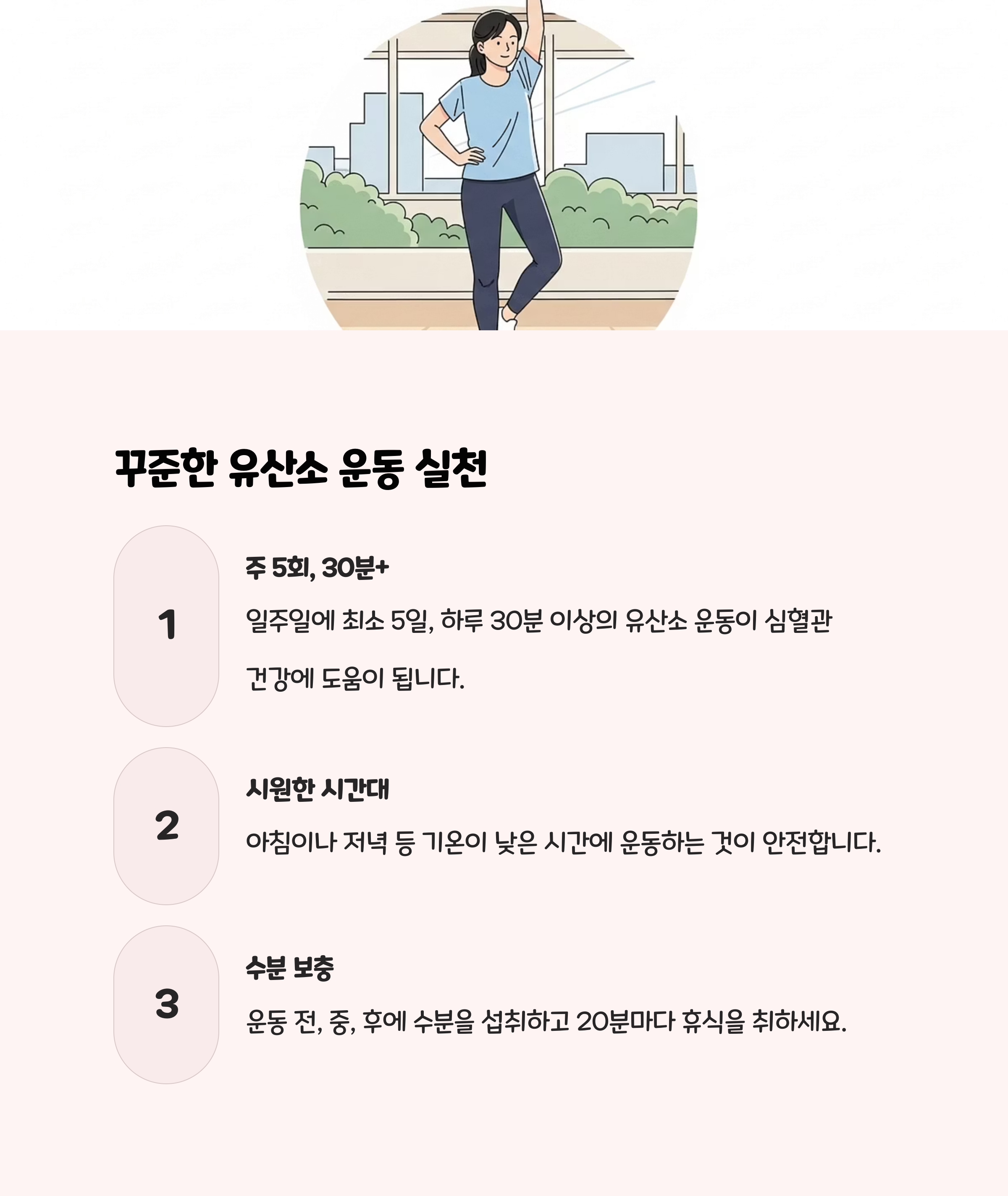 • 규칙적인 운동은 심혈관 건강에 필수입니다. 매일 30분 이상, 주 5일 이상 빠르게 걷기, 자전거 타기, 수영 등 유산소 운동을 실천하세요.