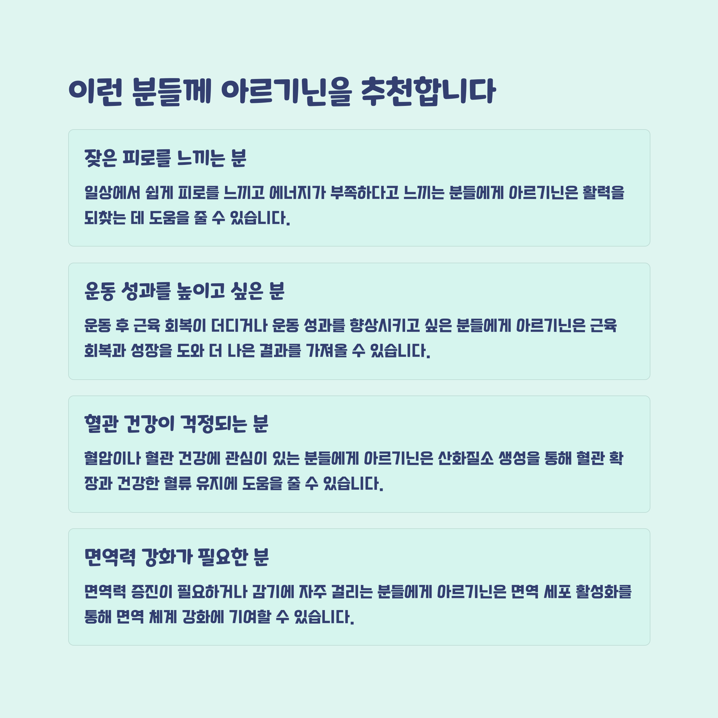 아르기닌은 운동 후 피로를 느끼는 사람, 체력 저하를 겪는 직장인, 면역력이 약한 사람 등 활력을 필요로 하는 모든 사람에게 적합합니다. 특히 운동선수나 활동량이 많은 사람들에게 더욱 유용합니다.