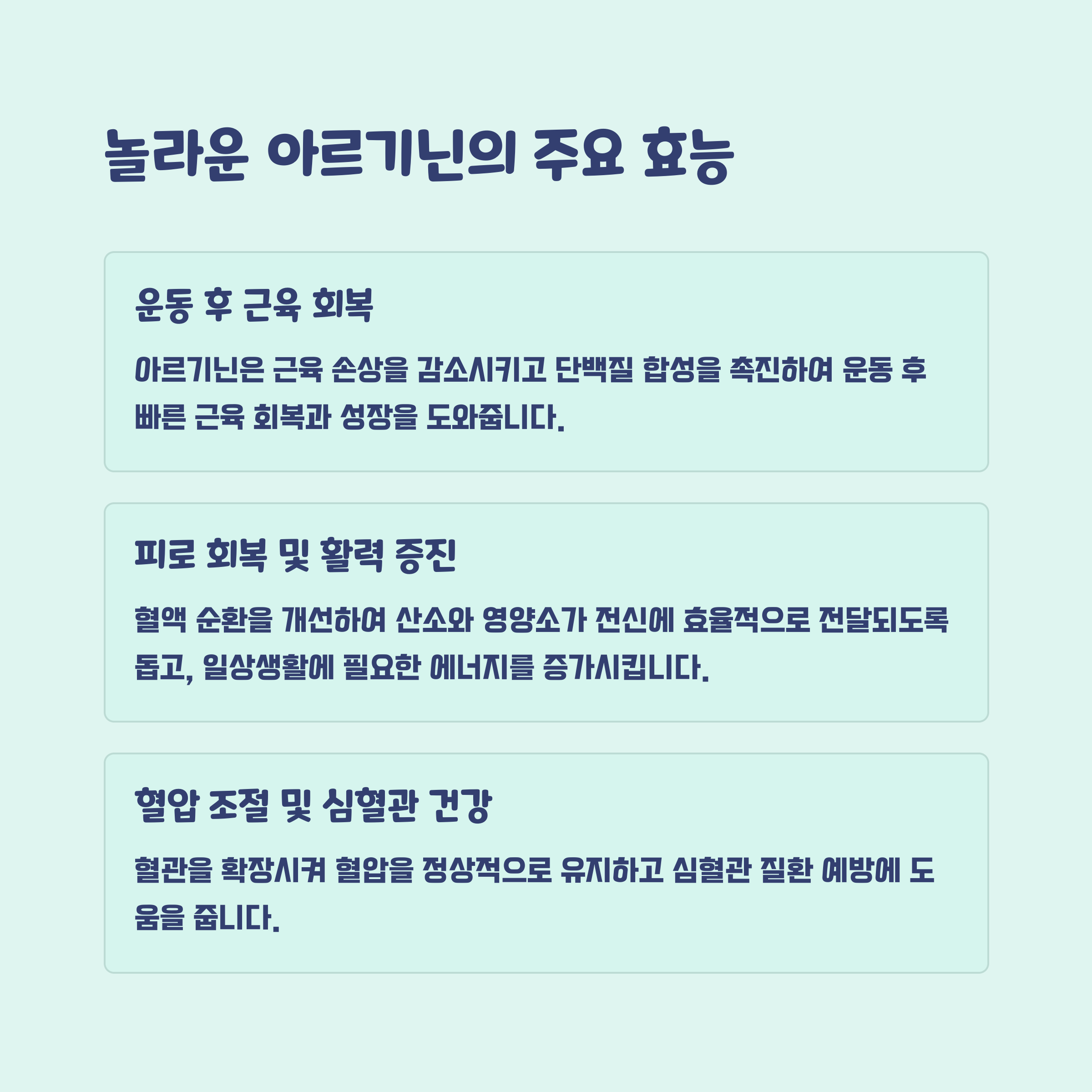 • 혈액 순환 개선 : 산화질소 생성으로 혈액 순환이 활발해져 근육에 산소와 영양소 공급이 원활해집니다.